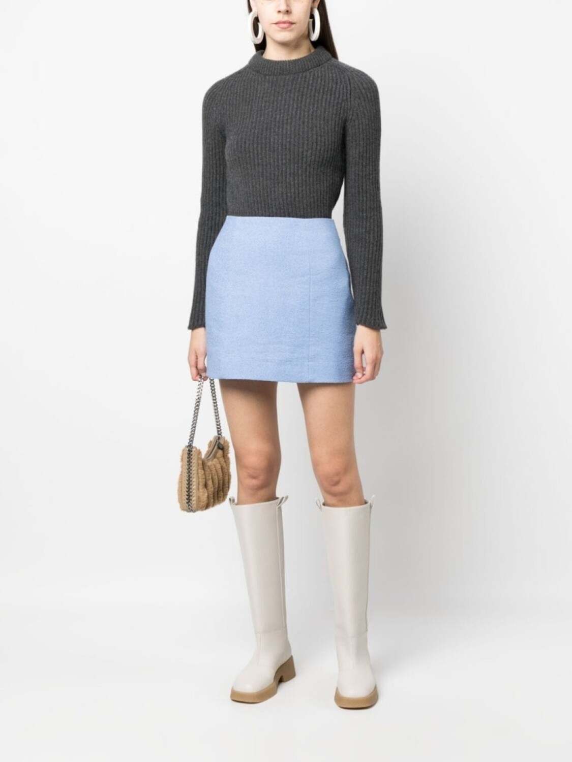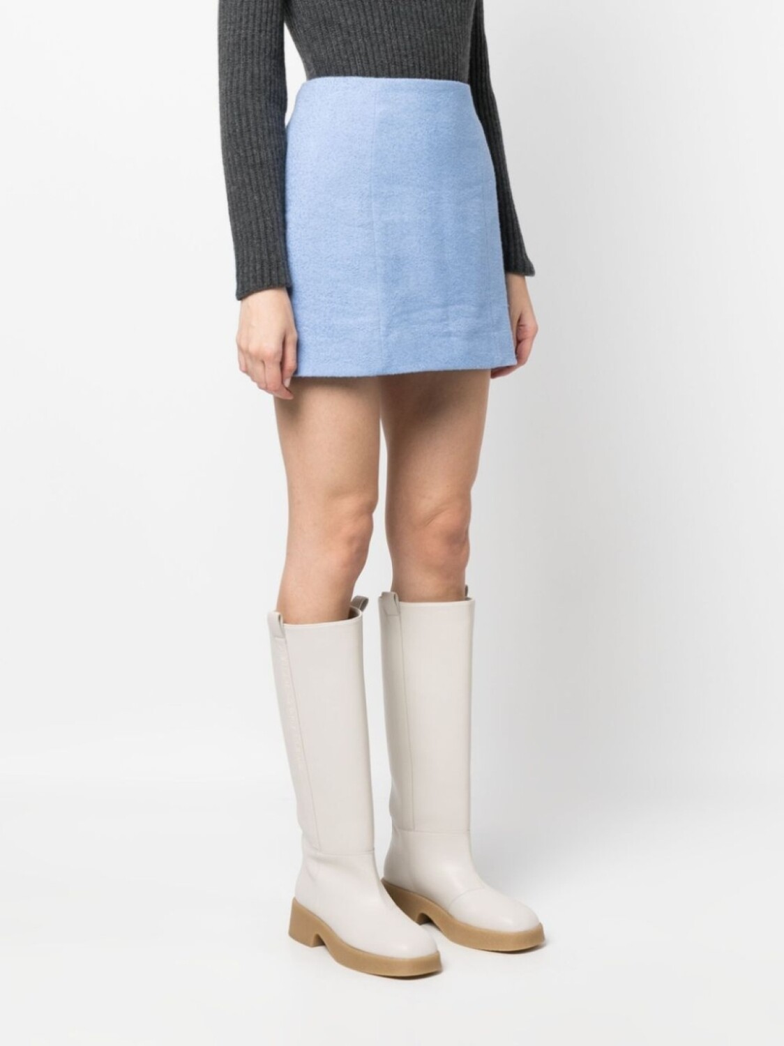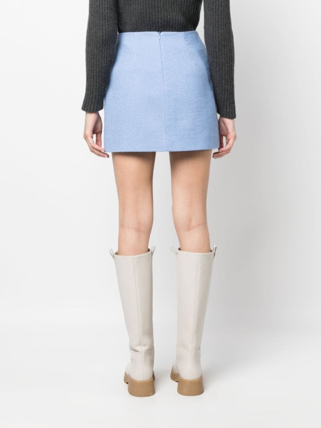 Голубой, смесовый лен, завышенная талия, застежка на молнии сзади и длина до бедер.