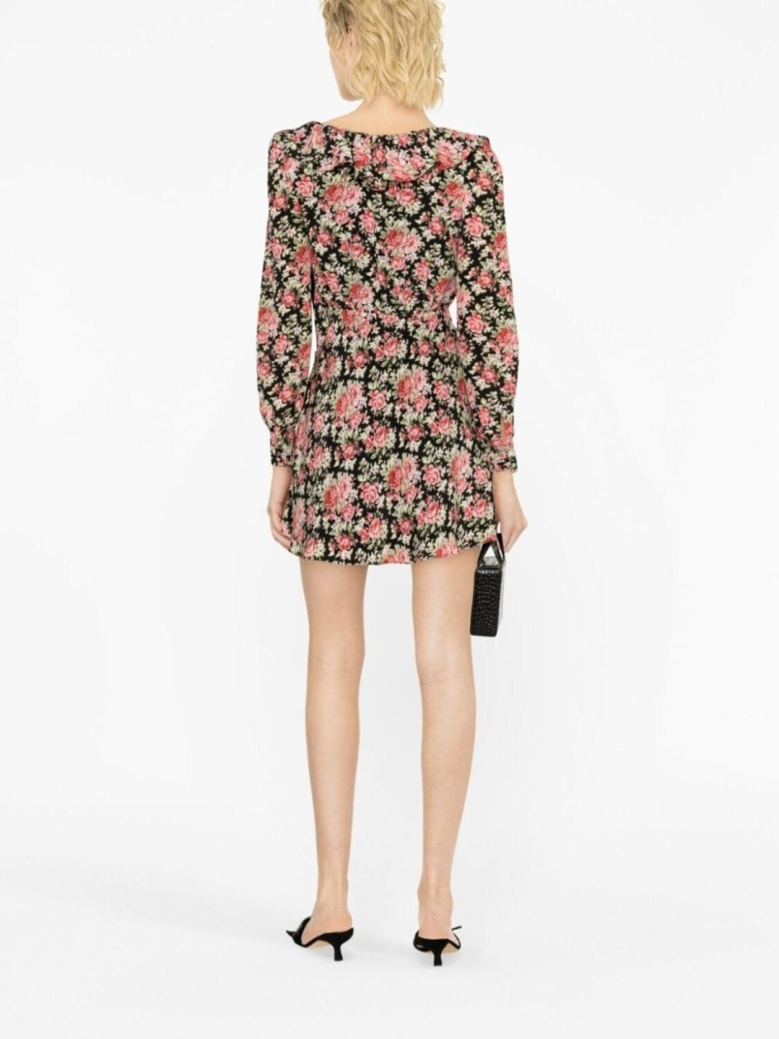 Черный/разноцветный, шелк, расклешенный крой, сплошной принт с изображением роз, бант, пуговицы из искусственного жемчуга, вставки с оборками, V-образный вырез, потайная застежка на молнии сбоку, длинные рукава и длина до бедер.
