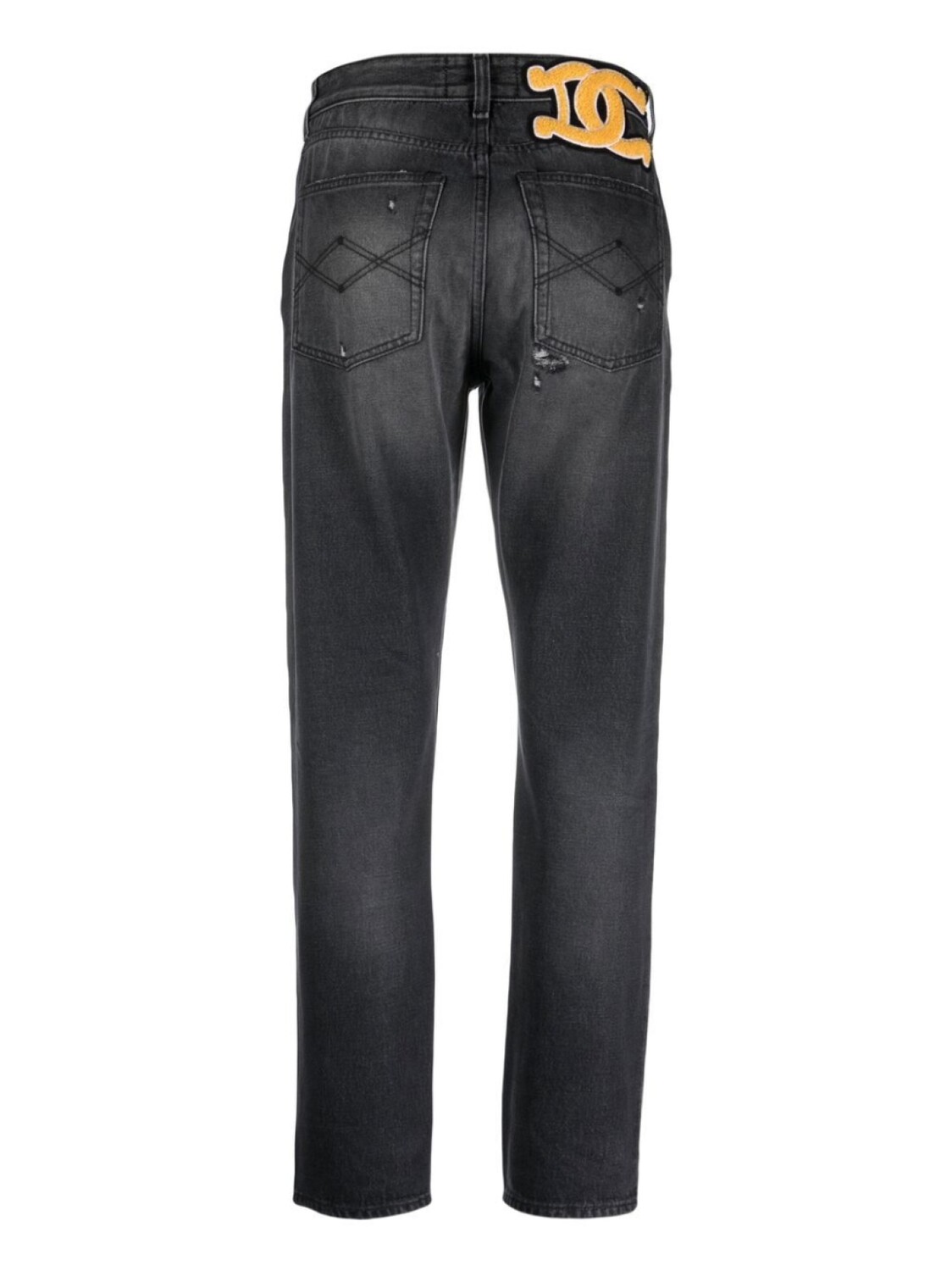 Темно-серый, хлопок, темный оттенок денима, детали в рубчик, эффект потертости, нашивка с логотипом сзади, петли для ремня, застежка на молнии и пуговице спереди и прямой крой.