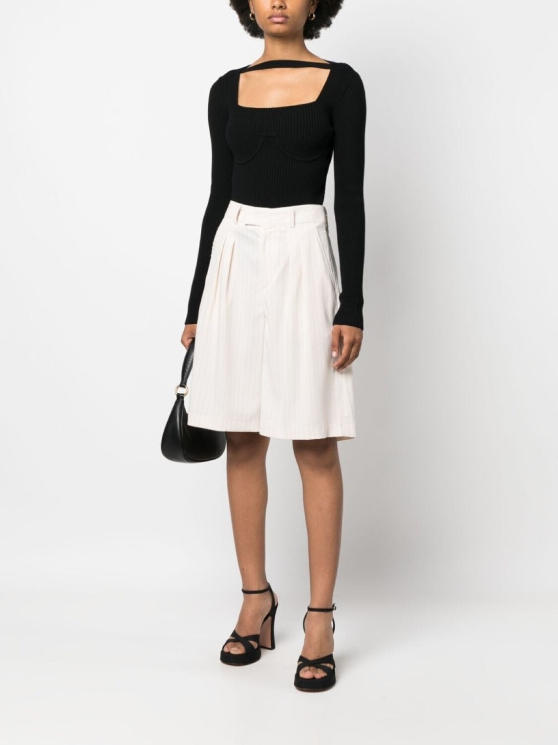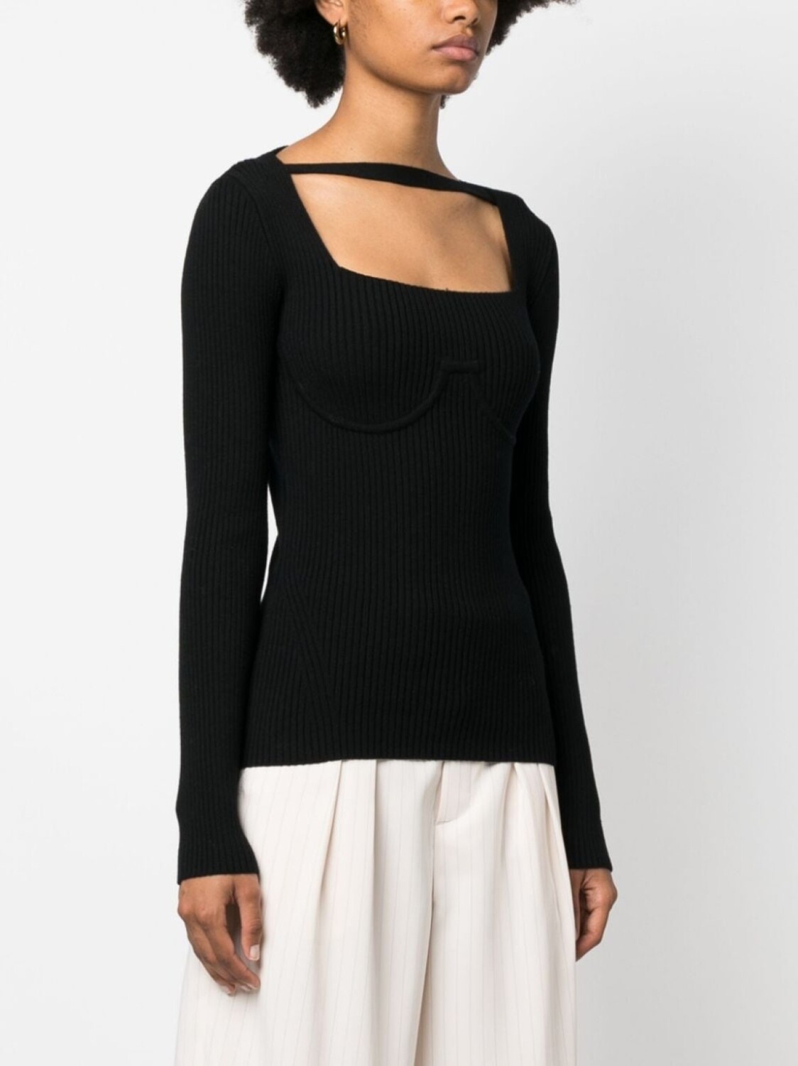 Черный, круглый вырез, вырезные детали и длинные рукава.