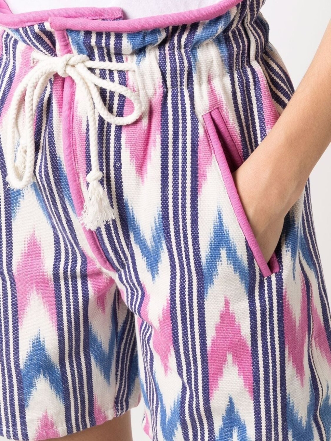 Сплошной графичный принт, эластичный пояс на шнурке, два вшитых кармана по бокам и два кармана с листочкой сзади. Цвет: разноцветный.