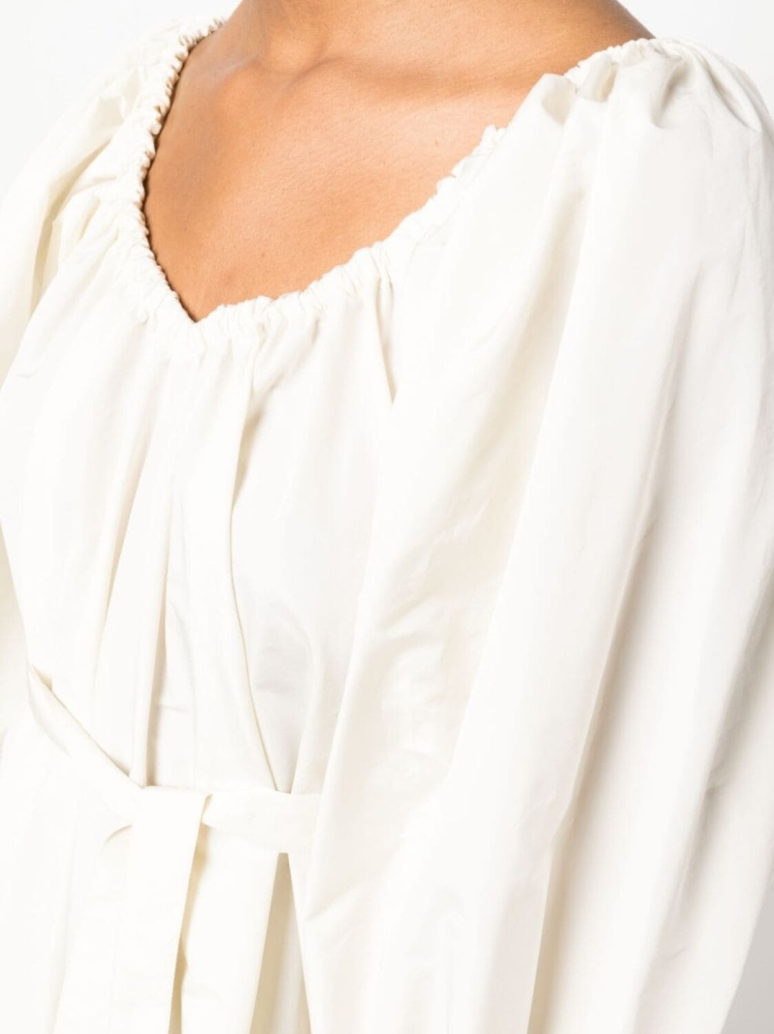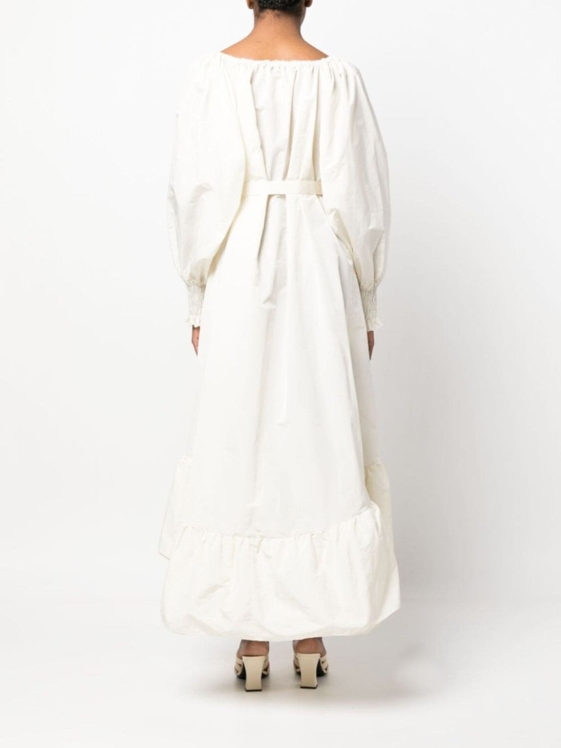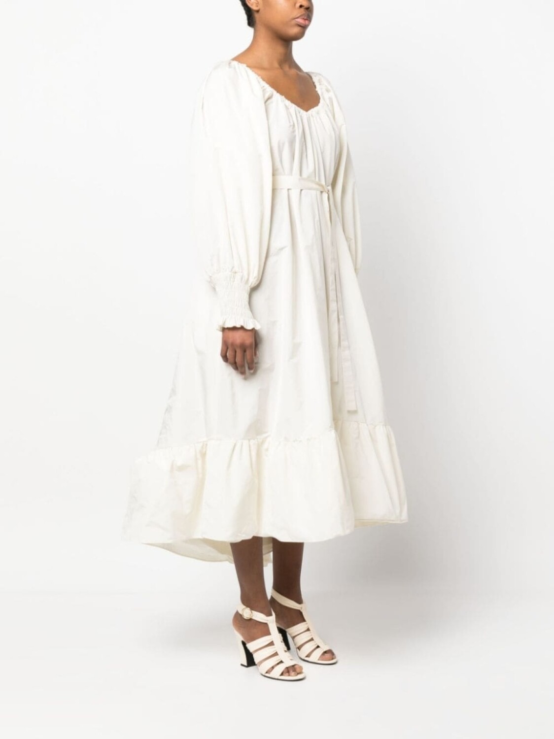 Цвет слоновой кости, переработанный полиэстер, дизайн со сборками, объемные рукава, ремень на талии, два вшитых кармана по бокам, ярусная юбка и асимметричный подол.