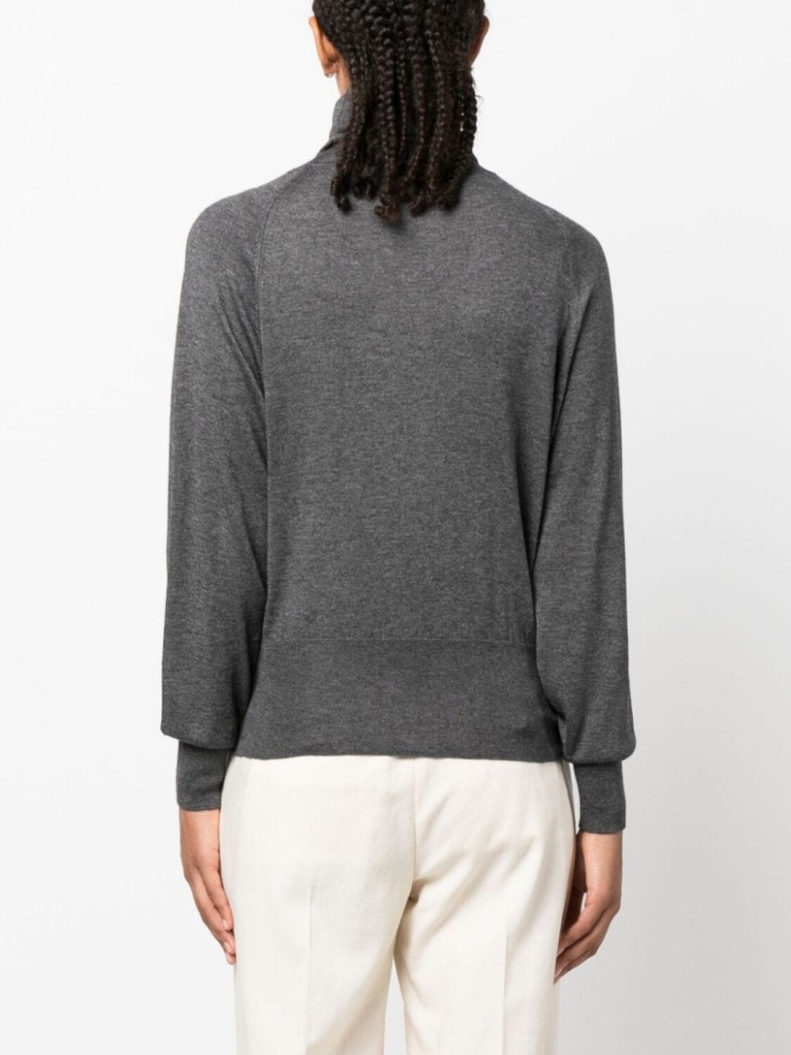 Холодный серый, смесь кашемира и шелка, тонкая вязка, высокий воротник и рукава реглан.
