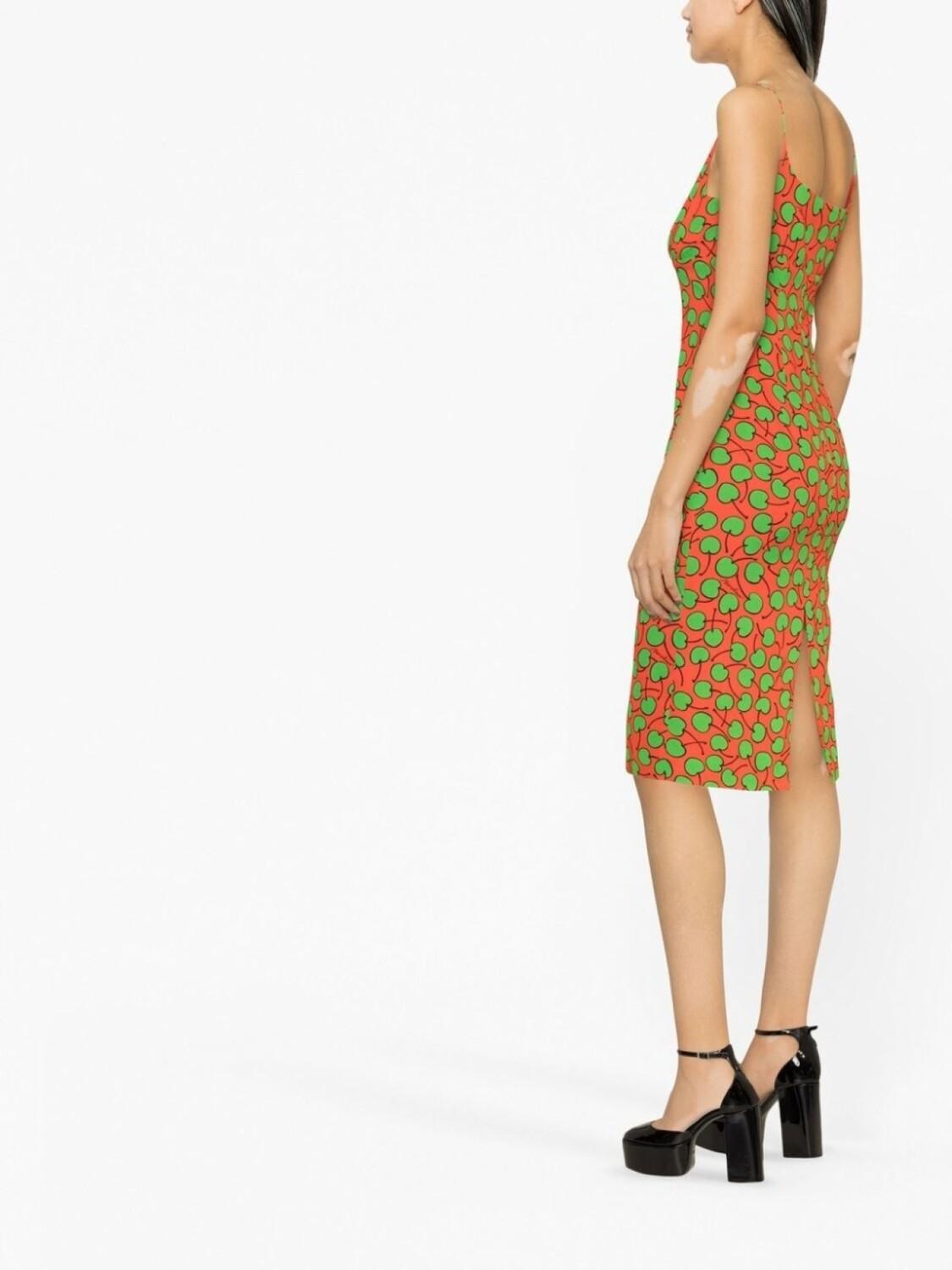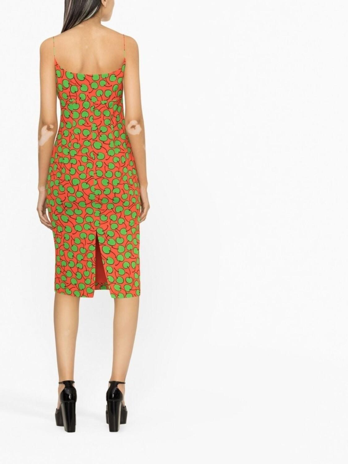 Красный, цвет зеленого яблока, сплошной графичный принт, U-образный вырез, тонкие бретели, вырез сзади и длина до середины икры.