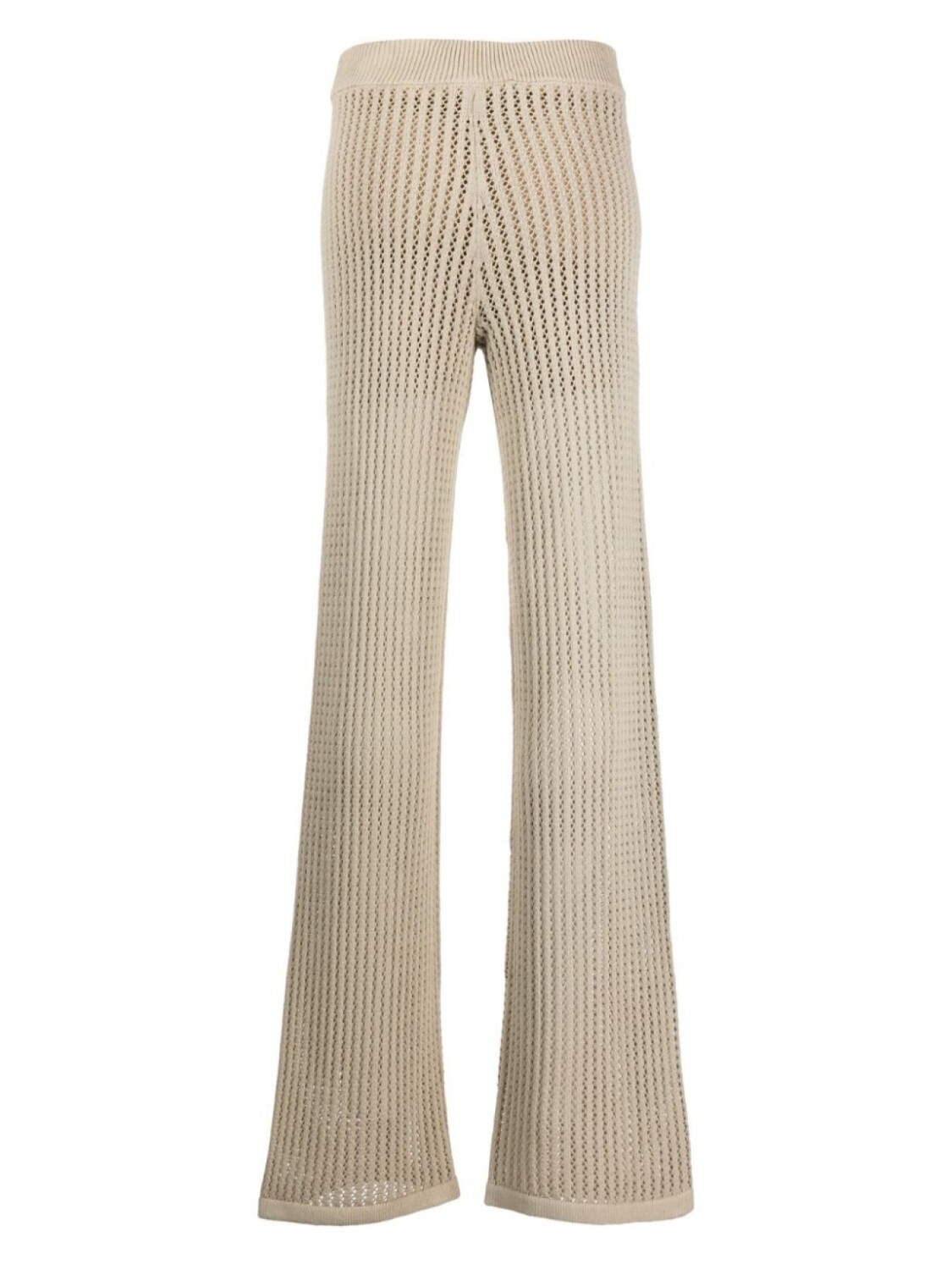 Светло-бежевый, трикотажный материал, ажурная вязка, отделка в рубчик, прямой крой и кулиска на талии.