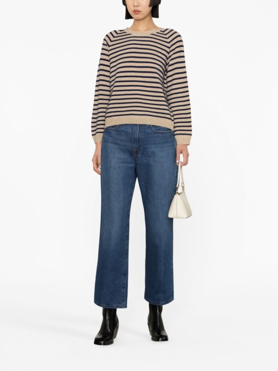 Бежевый, темно-синий, смесь шерсти и хлопка, тонкая вязка, узор в горизонтальную полоску, отделка в рубчик, круглый вырез, длинные рукава реглан и прямой подол.