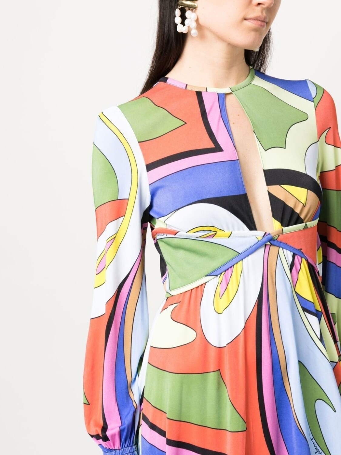 Разноцветный, сплошной графичный принт, вставки, вырез с прорезью, длинные рукава, эластичные манжеты и прямой подол.