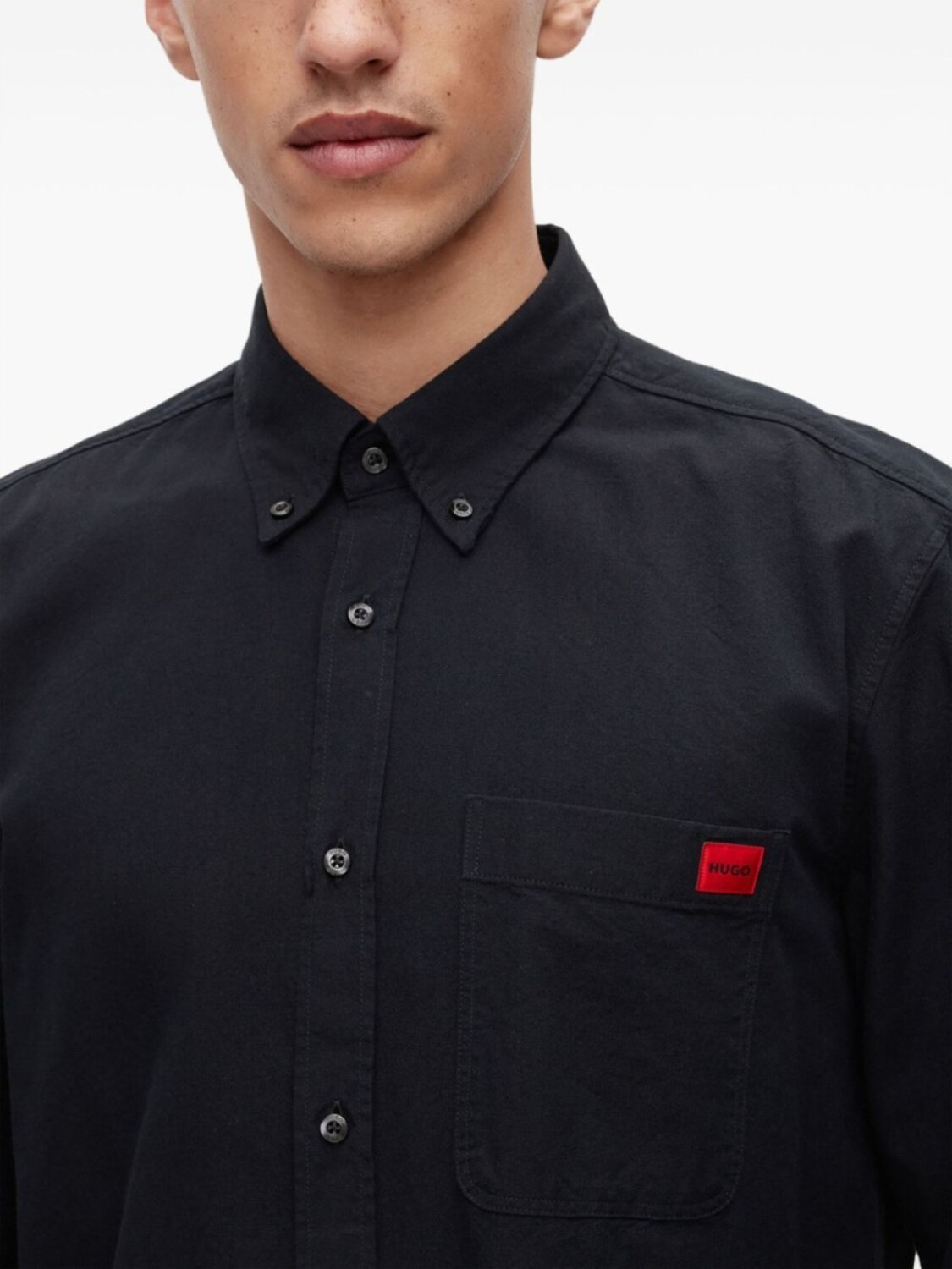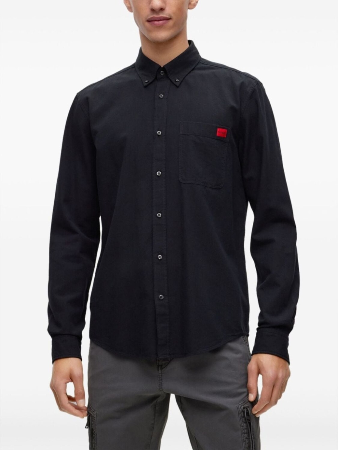 Черный, хлопок, логотип-аппликация, воротник на пуговицах, застежка на пуговицах спереди, длинные рукава, манжеты на пуговицах, нагрудный накладной карман и закругленный подол.