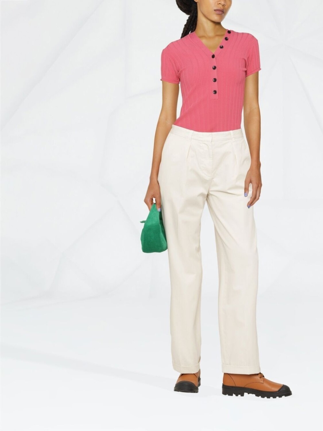 Кремовый, хлопок, застежка на пуговицах спереди, два кармана по бокам, складки и прямой крой.