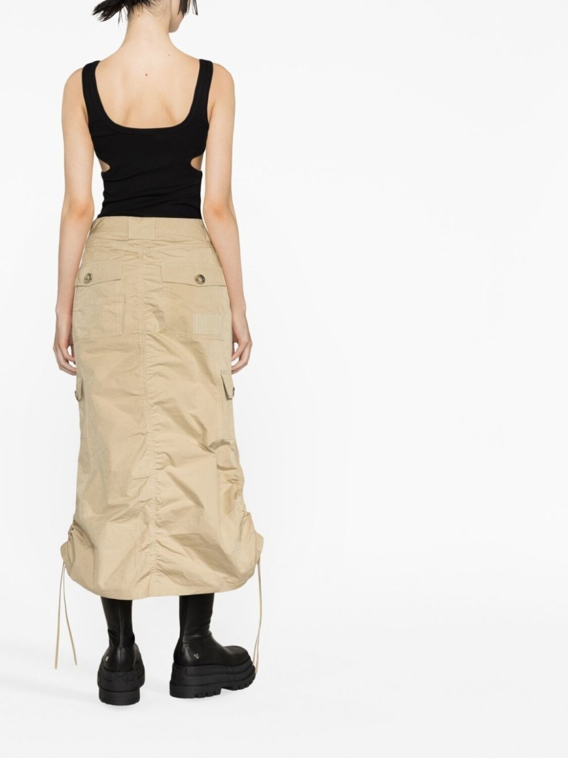 Бежевый, сатиновый финиш, потайная застежка спереди, петли для ремня, два накладных кармана по бокам, два прорезных кармана сбоку, два кармана с клапанами сзади, подол с кулиской и длина миди.