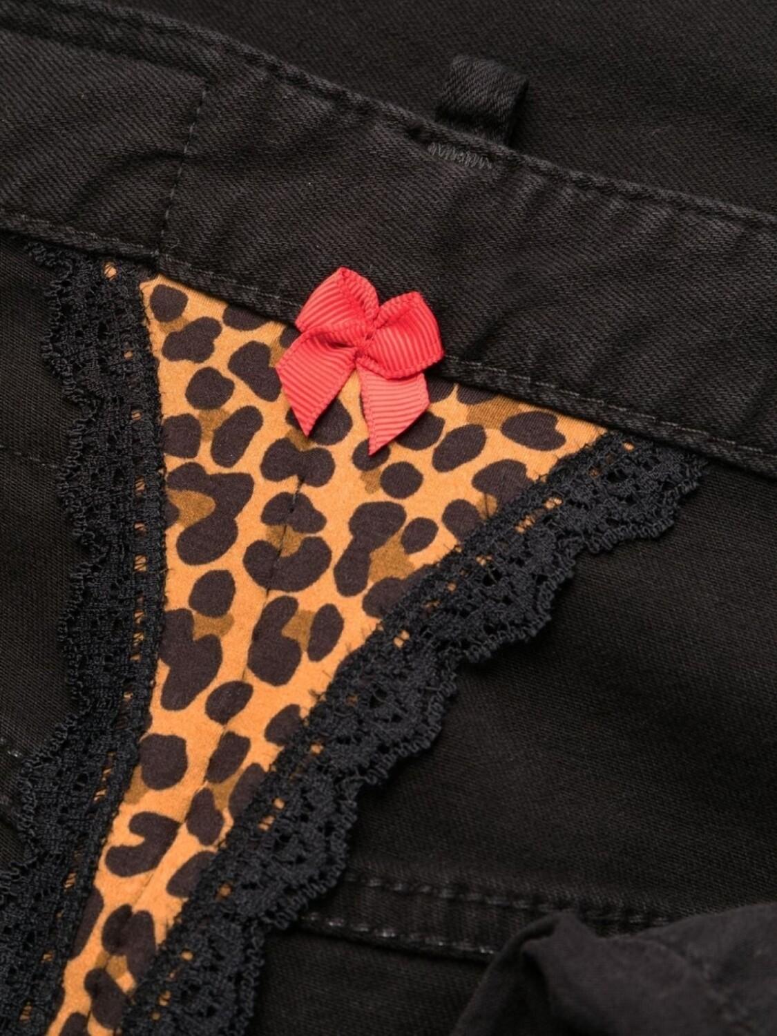 Black, stretch-cotton, high-waisted, front button and zip fastening, belt loops, classic five pockets, tapered leg, cropped, logo patch to the rear