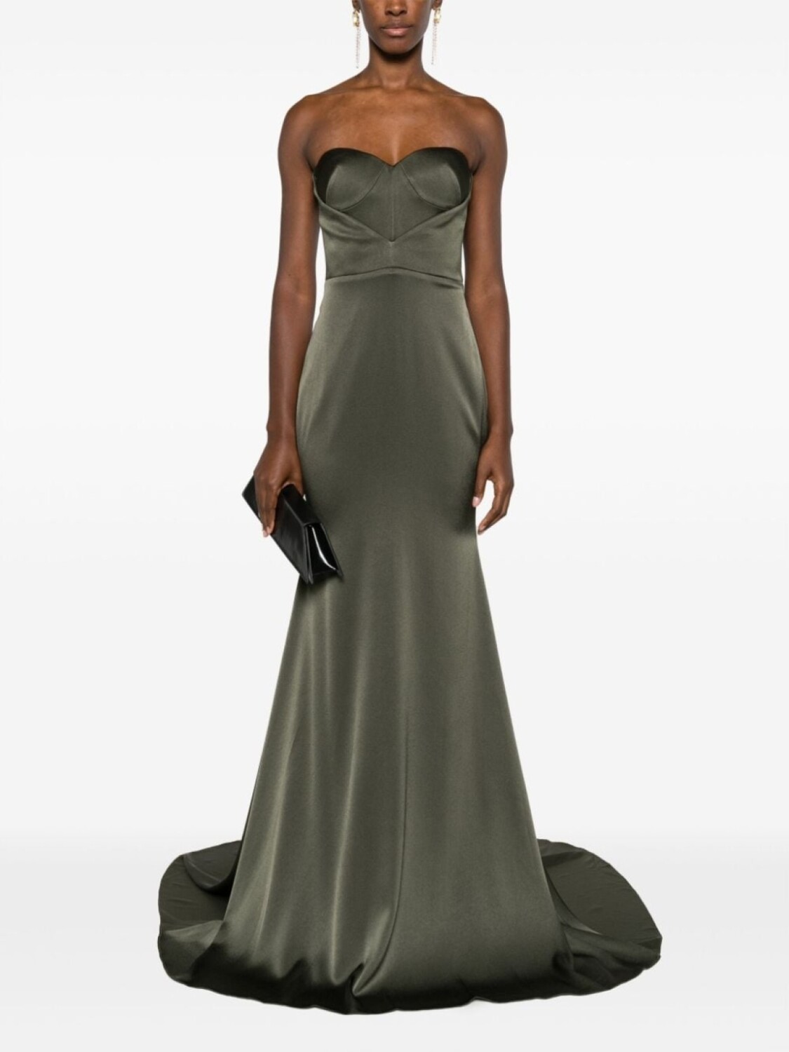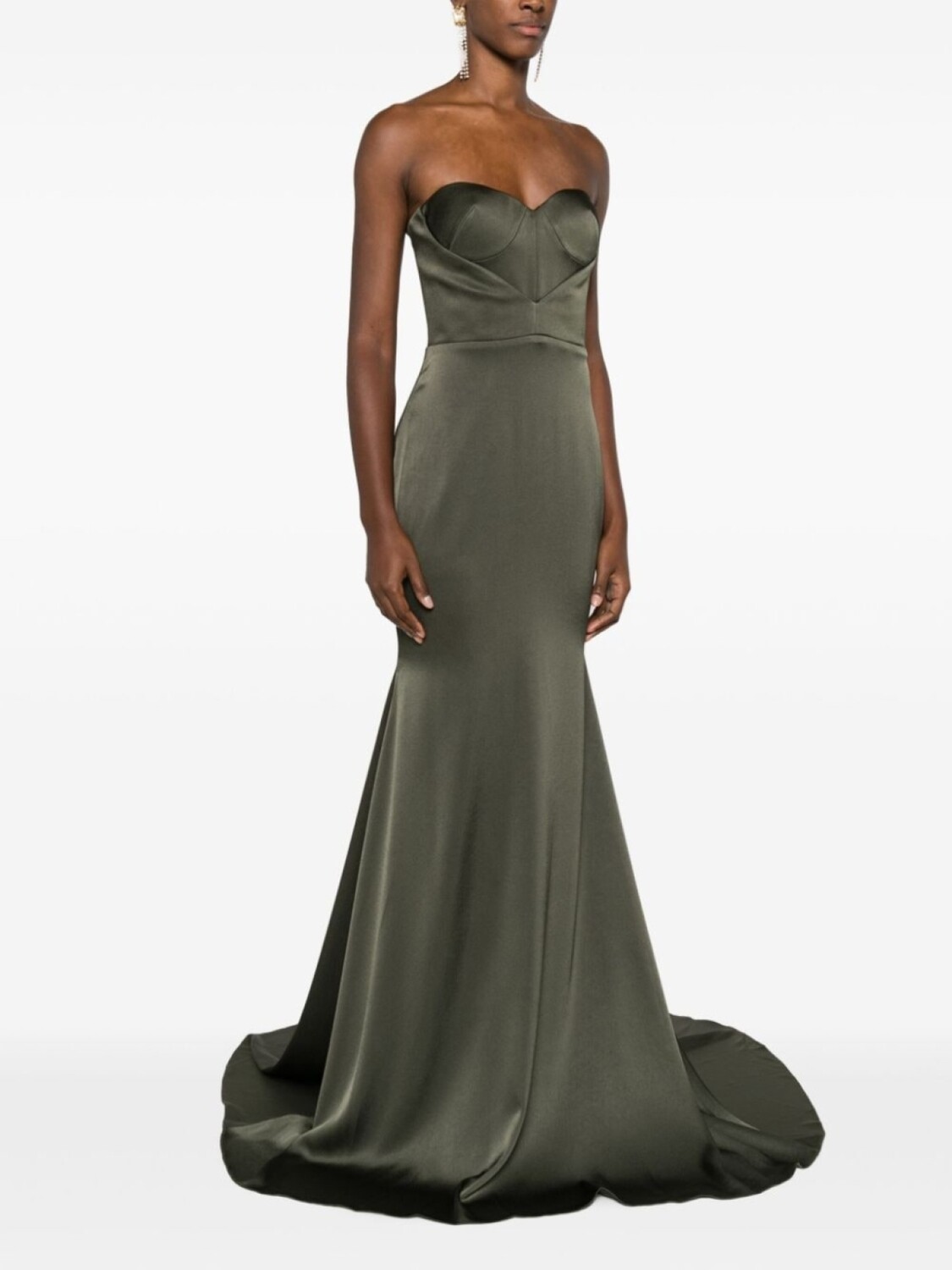 Темно-зеленый, без бретелей, вырез в форме сердца, застежка на молнии сзади, длина макси и шлейф.