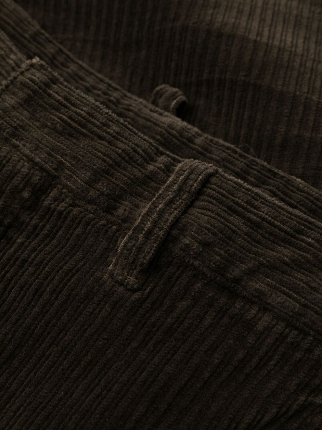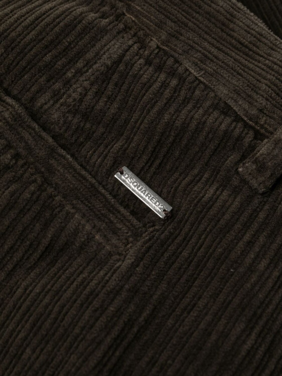 Шоколадный, хлопок, вельветовый материал, потайная застежка спереди, петли для ремня, два прорезных кармана по бокам, два кармана с листочкой сзади и широкий крой.
