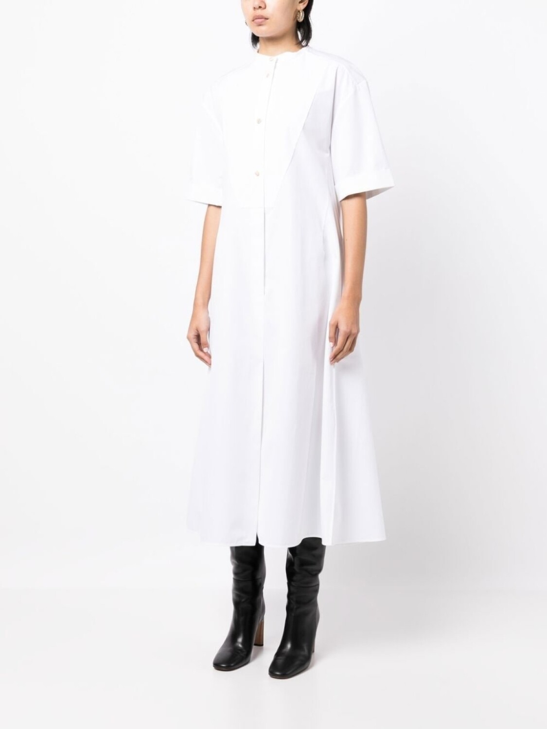 Белый, хлопок, круглый вырез, застежка на пуговицах спереди, короткие рукава и длина миди.