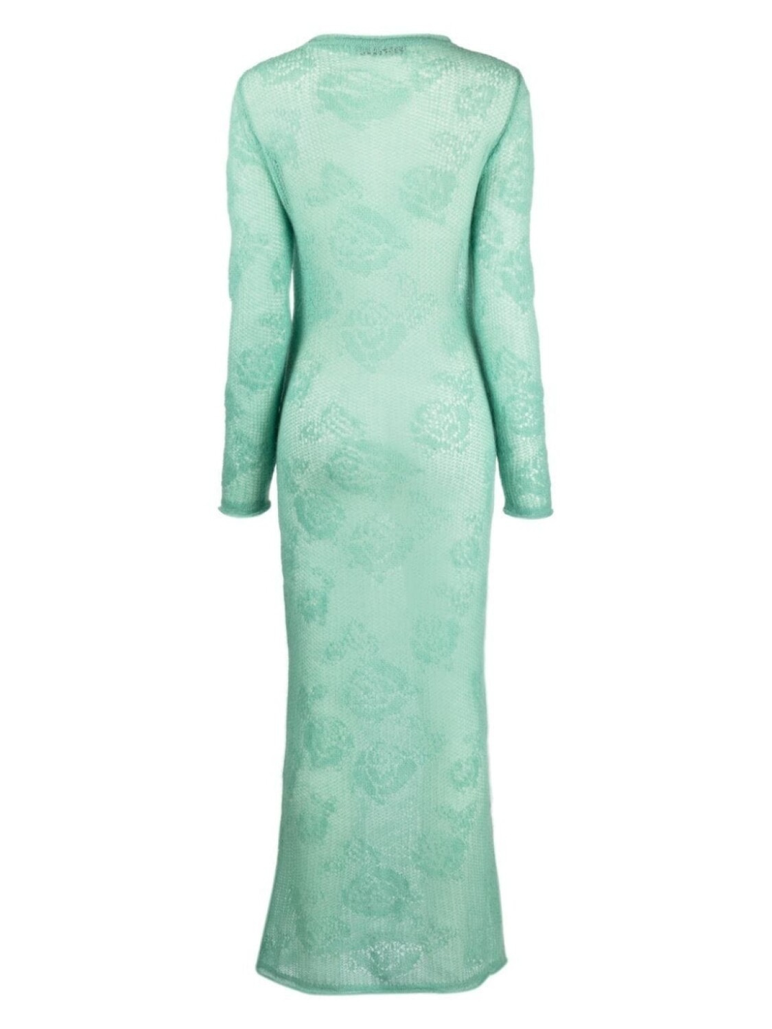 Сине-зеленый, мохер, смесовая шерсть мериноса, трикотажный материал, ажурная вязка, цветочная аппликация, высокий воротник, длинные рукава, прямой подол и длинная модель.