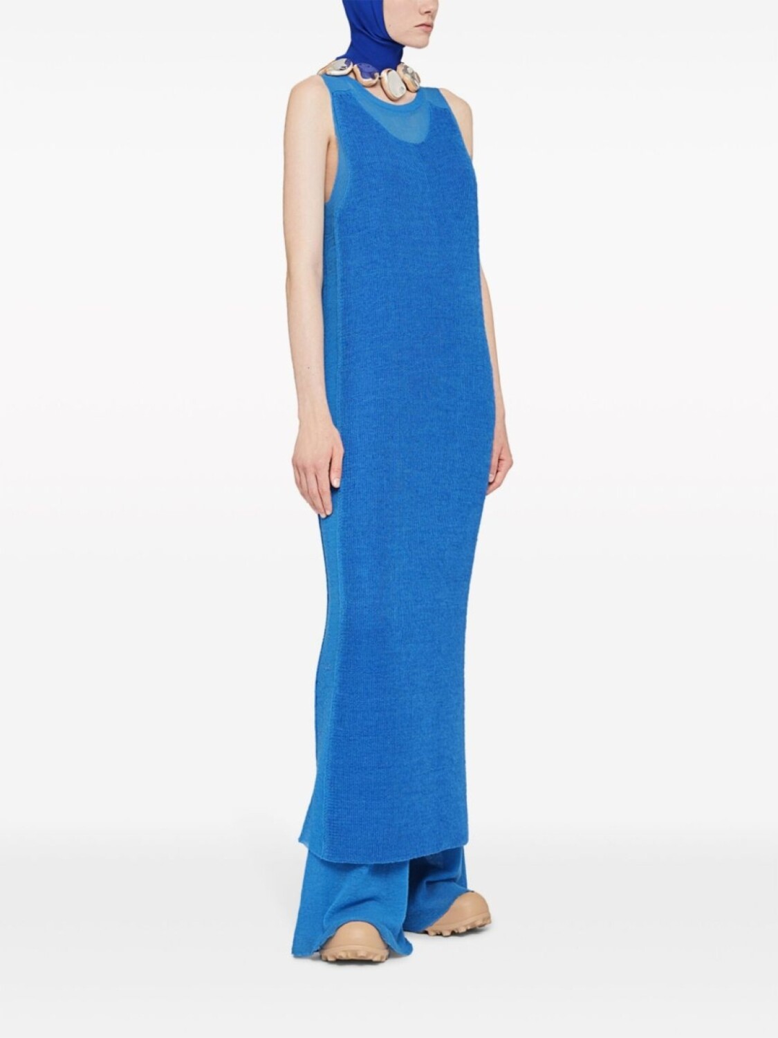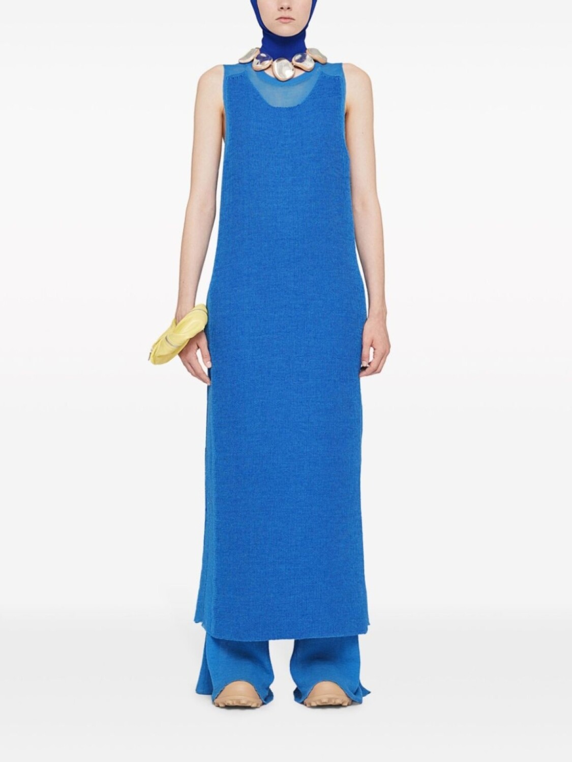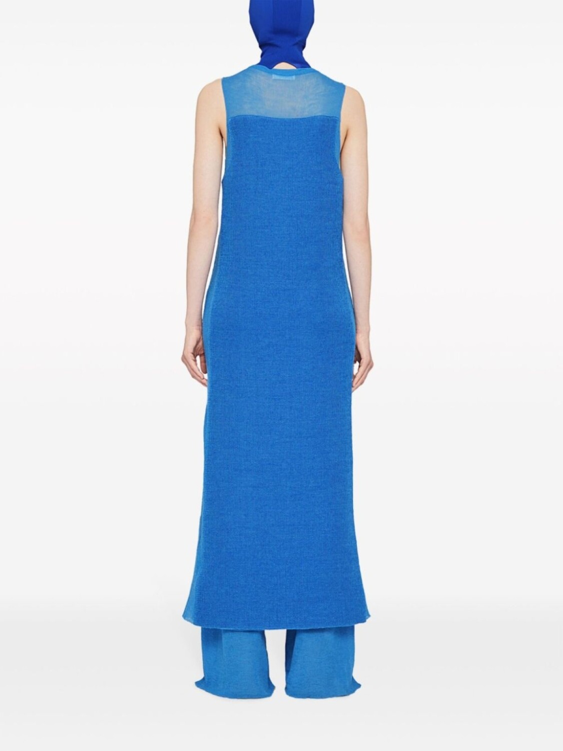 Лазурно-синий, смесовая шерсть, трикотажный материал, полупрозрачные вставки, круглый вырез, без рукавов и высота по щиколотку.
