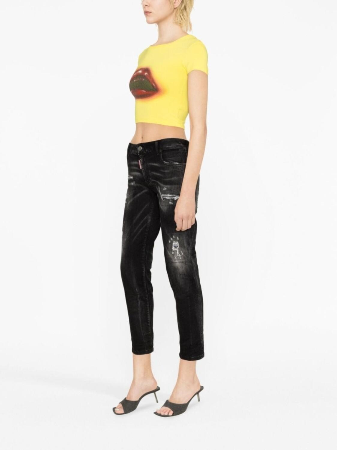 Черный, смесовый хлопок, эффект потертости, эффект потертости, петли для ремня, застежка на молнии и пуговице спереди, пять карманов, укороченная длина и узкий крой.