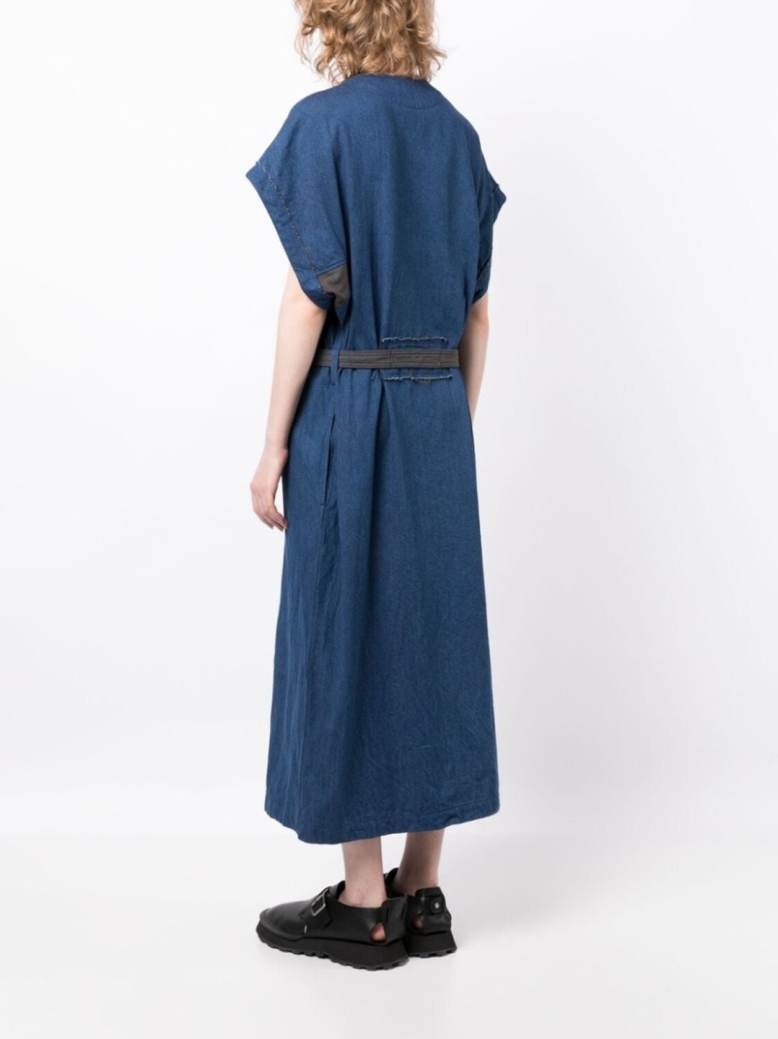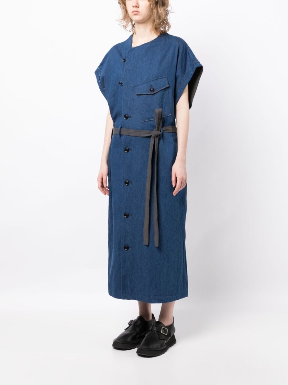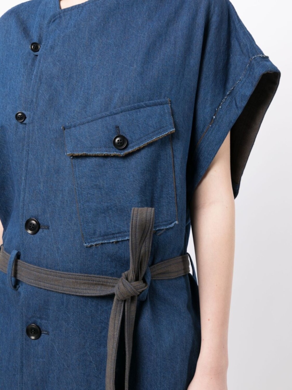 Индиго, хлопок, деним, ткань с твиловым переплетением, асимметричный вырез, ремень на талии, пуговичная застежка сбоку, короткие рукава, подвернутые манжеты, нагрудный карман на пуговице, прямой подол и длина до середины голени.