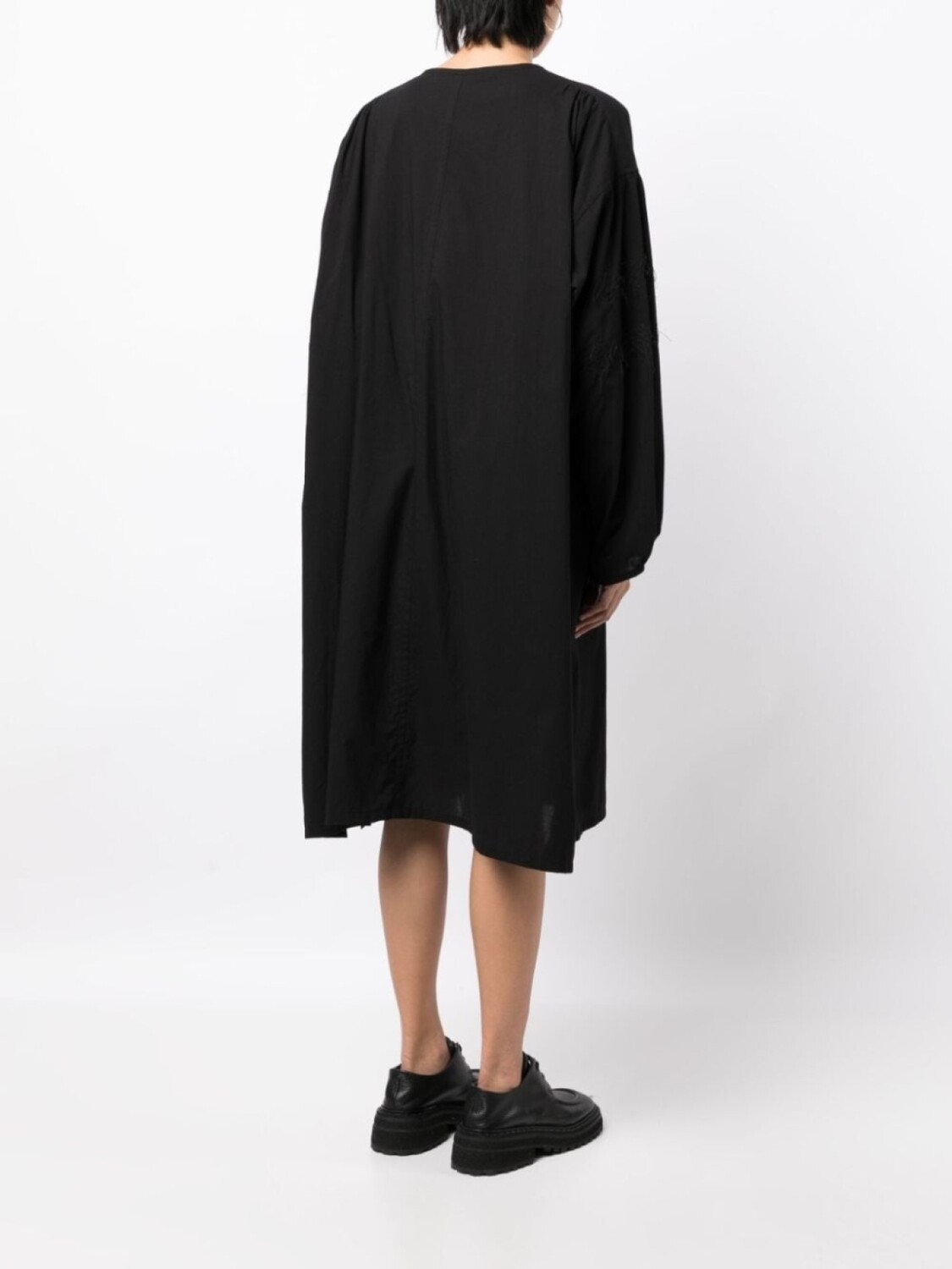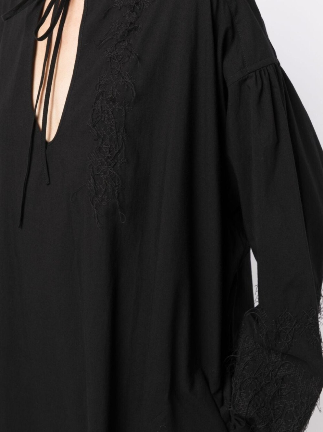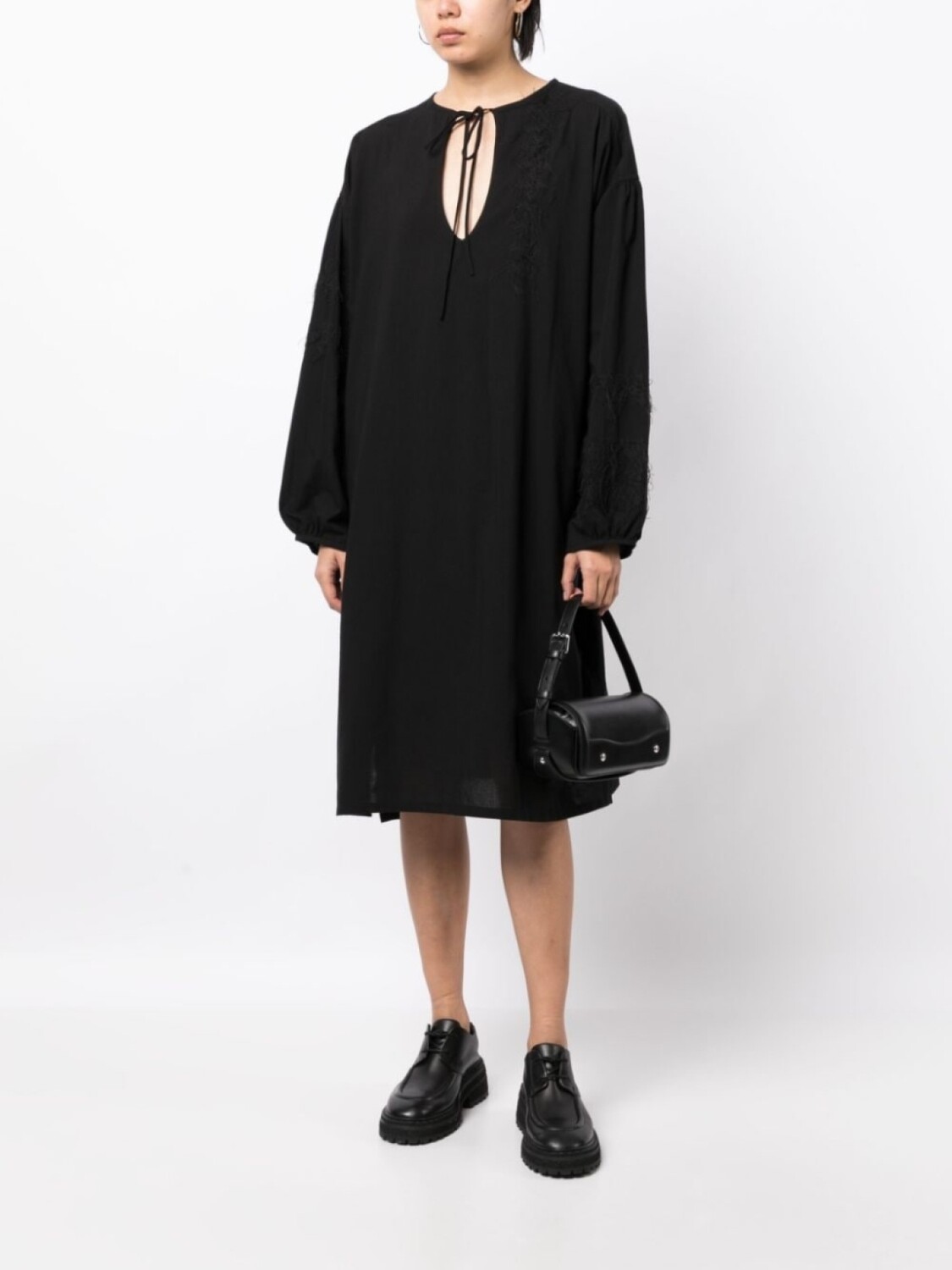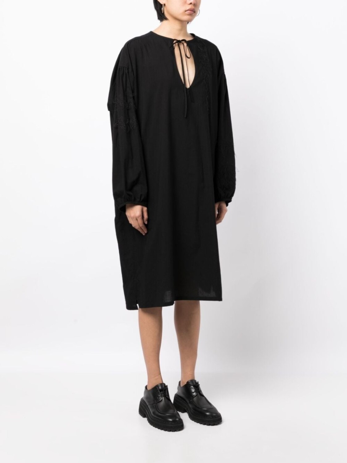 Черный, вышивка, воротник с кулиской, длинные рукава, приспущенные плечи, эластичные манжеты, прямой подол и длина миди.