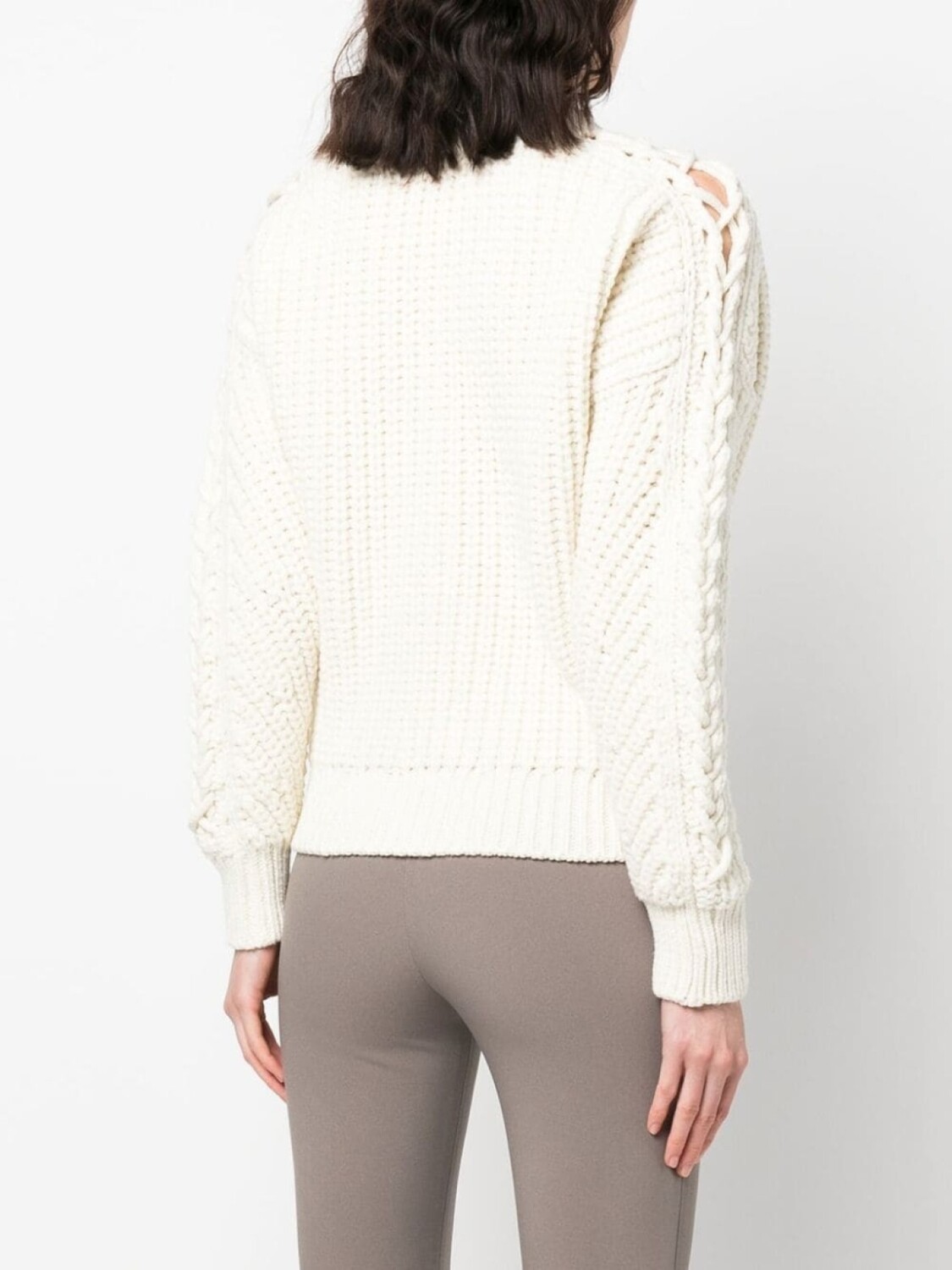 Экрю, смесовая шерсть, трикотаж в крупный рубчик, плетеная отделка, V-образный вырез, длинные рукава и прямой подол.