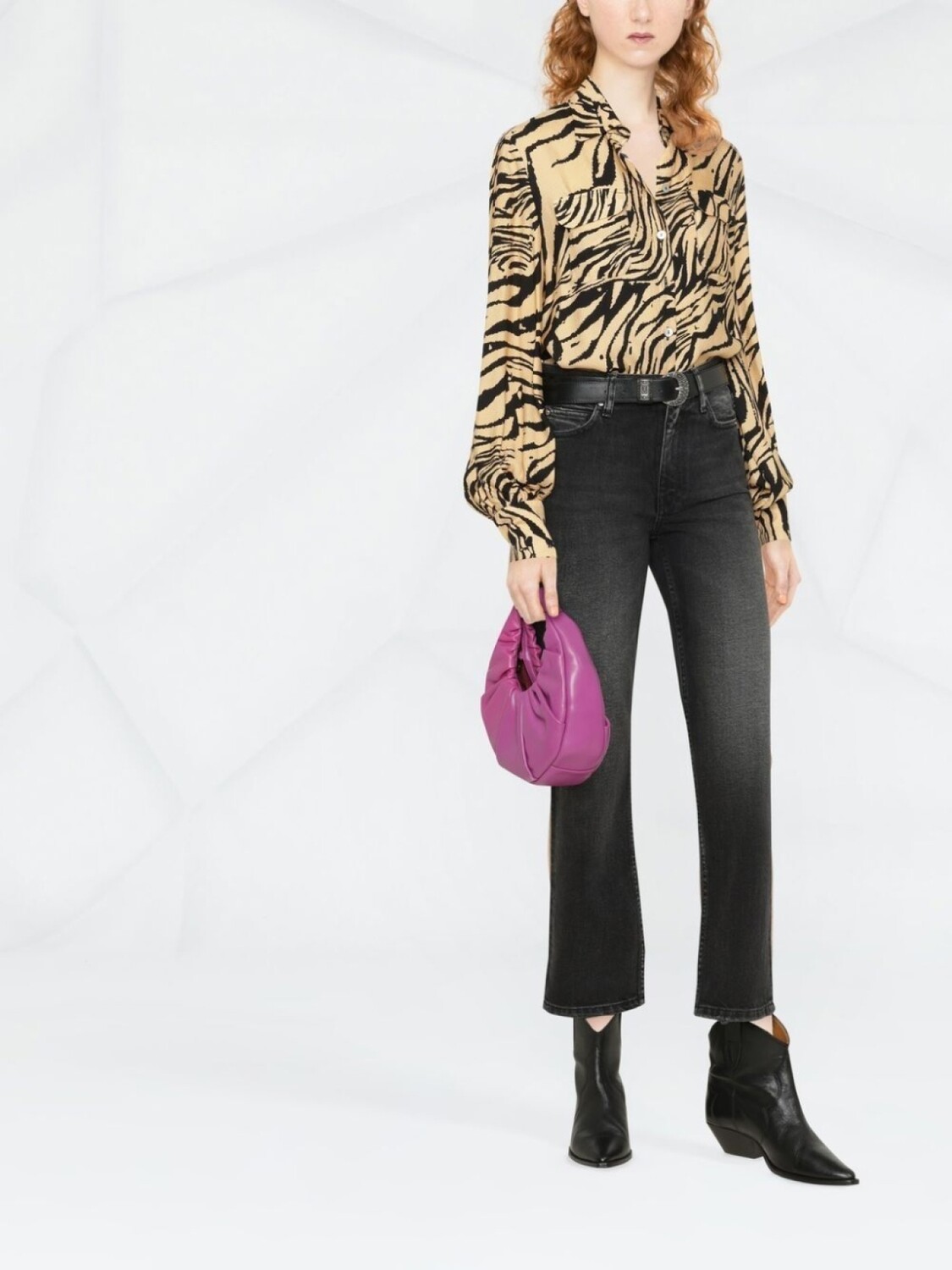Черный, органический хлопок, узкий крой, застежка на пуговицы, петли для ремня и пять карманов.