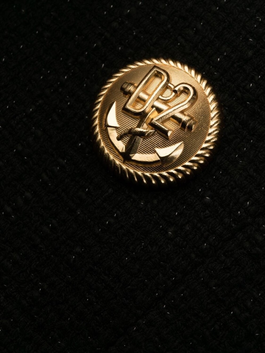Набор из двух предметов, двубортная застежка на кнопки, золотистые пуговицы с тиснением, заостренные лацканы, два передних кармана с клапанами, прорезной карман на груди, длинные рукава, манжеты на пуговицах, асимметричный подол, завышенная талия, асимметричный подол и длина до бедер. Цвет: черный.