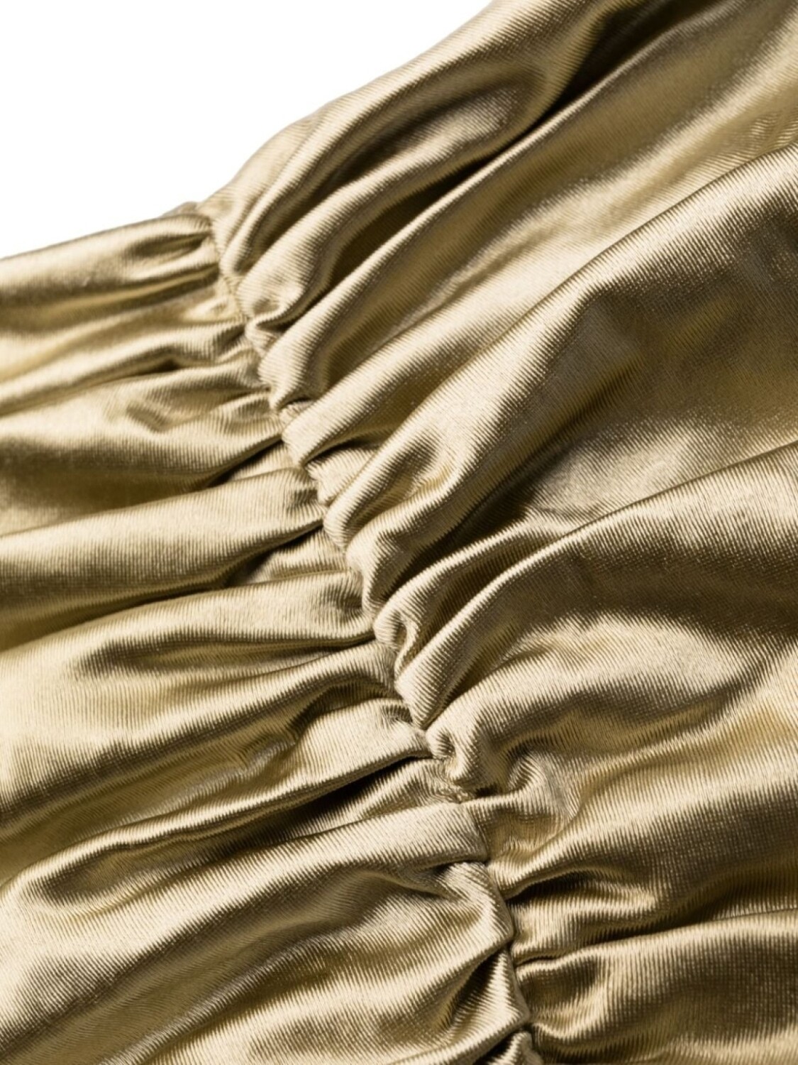 Серо-зеленый, эластичный материал, сатиновая фактура, дизайн со сборками и высокий вырез. Пожалуйста, примеряйте купальники и пляжные шорты только поверх собственного белья.