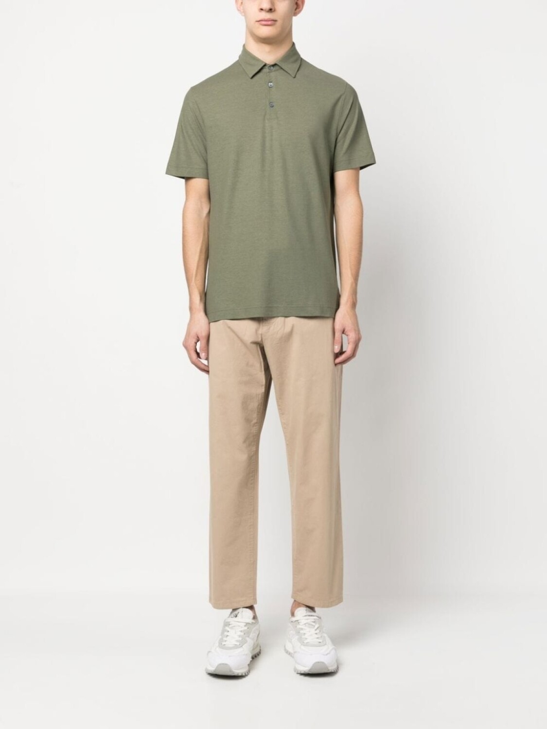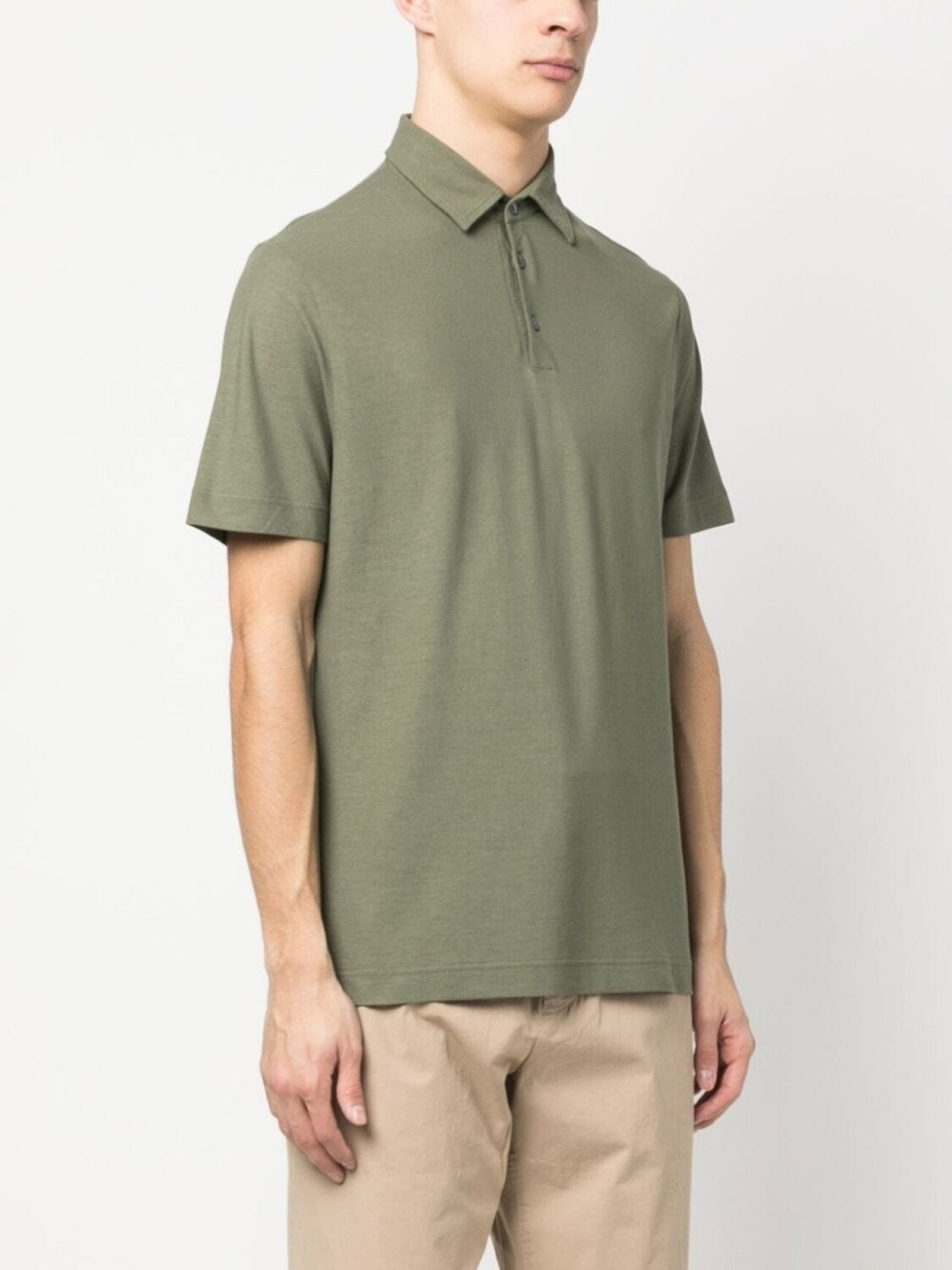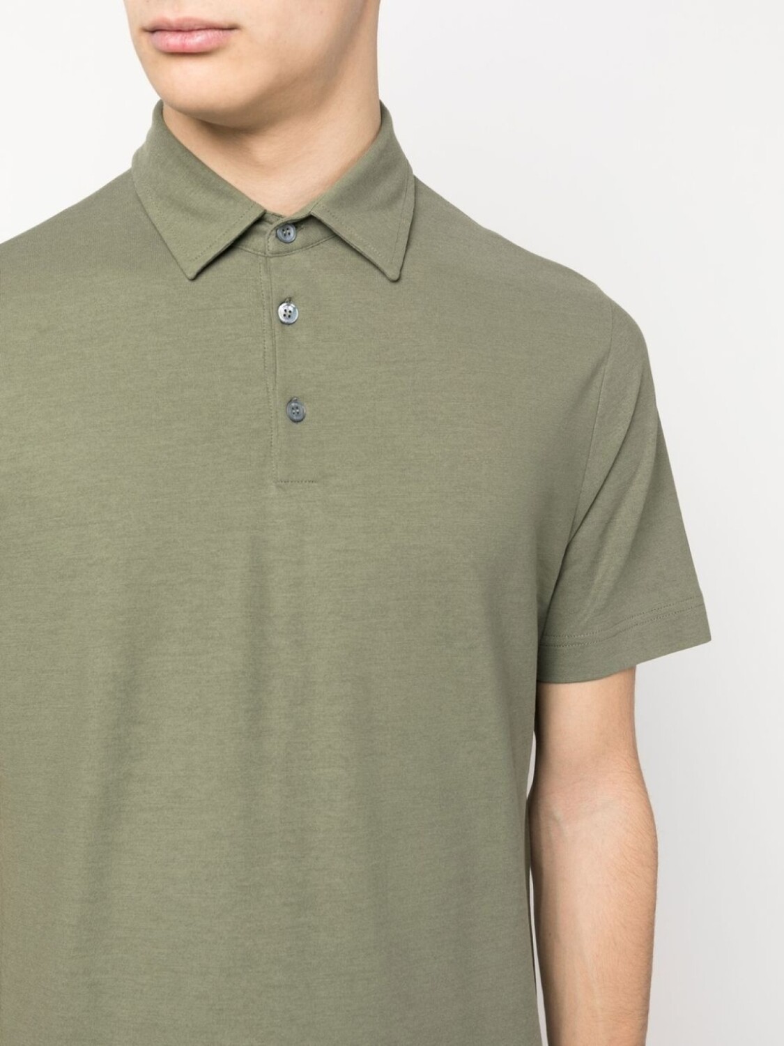 Серо-зеленый, хлопок, воротник поло, планка на пуговицах спереди и короткие рукава.