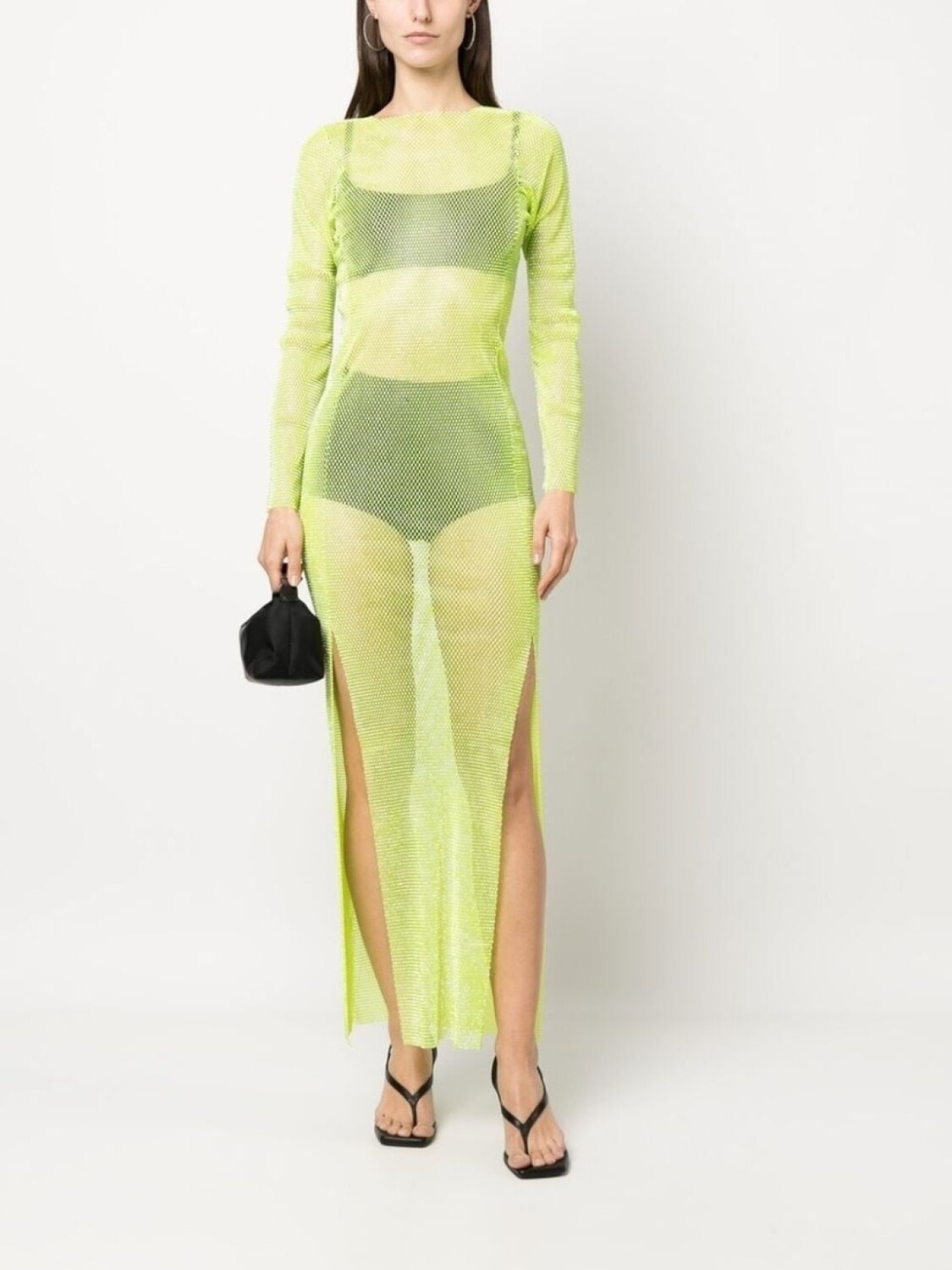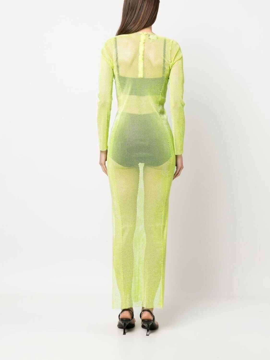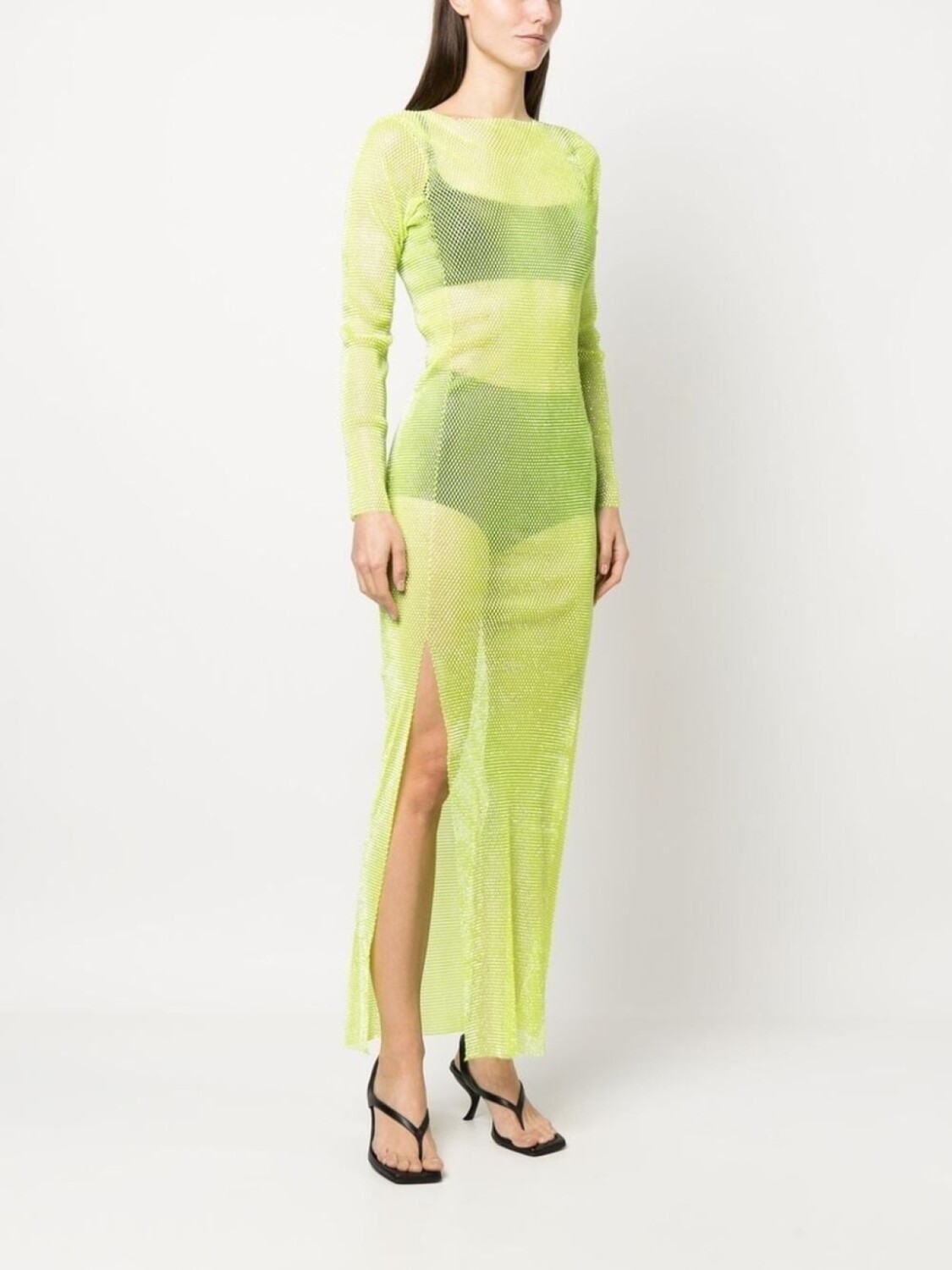 Зеленый, полупрозрачный дизайн, круглый вырез, длинные рукава, боковой разрез и высота по щиколотку.