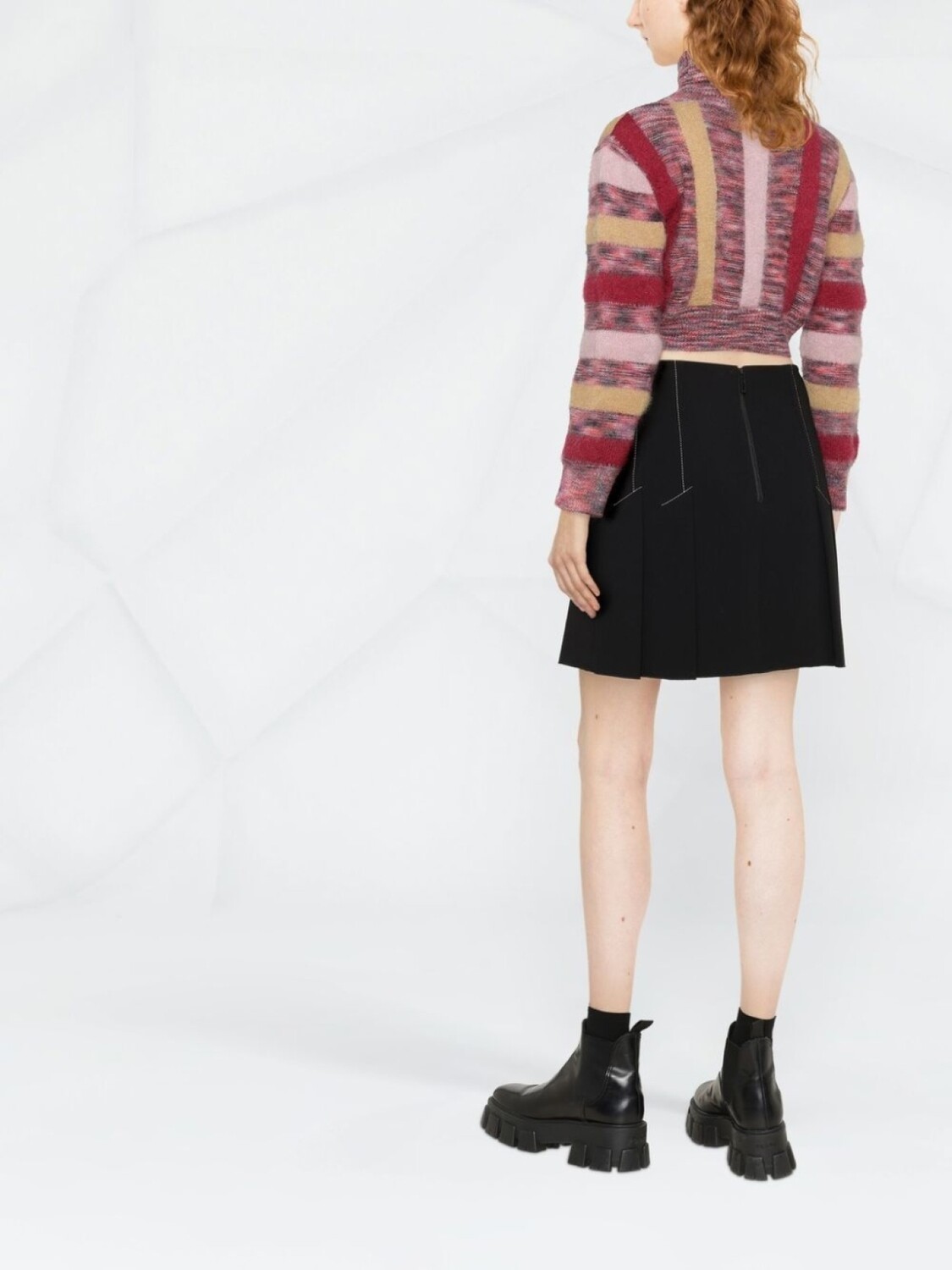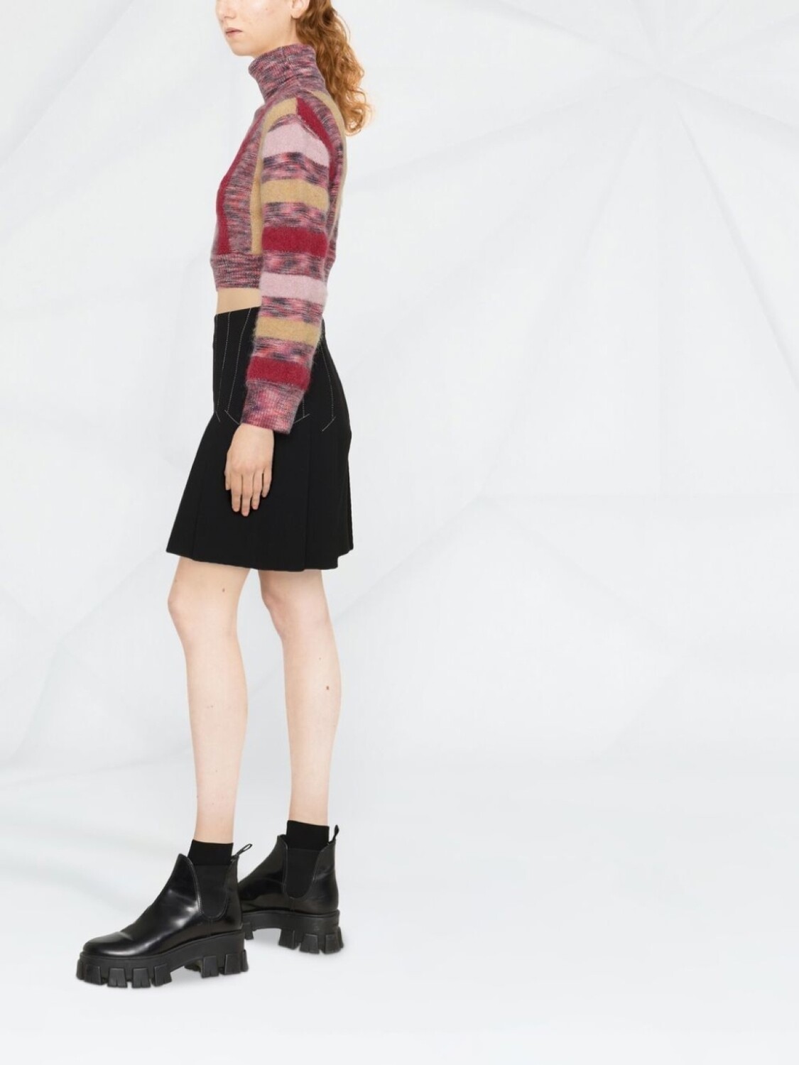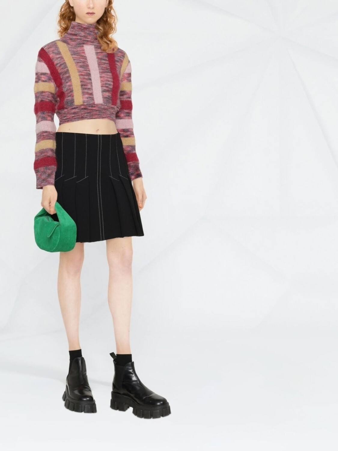 Разноцветный, смесь шерсти и мохера, трикотажный материал, узор в горизонтальную полоску, высокий воротник, длинные рукава, манжеты в рубчик, подол в рубчик и укороченная длина.