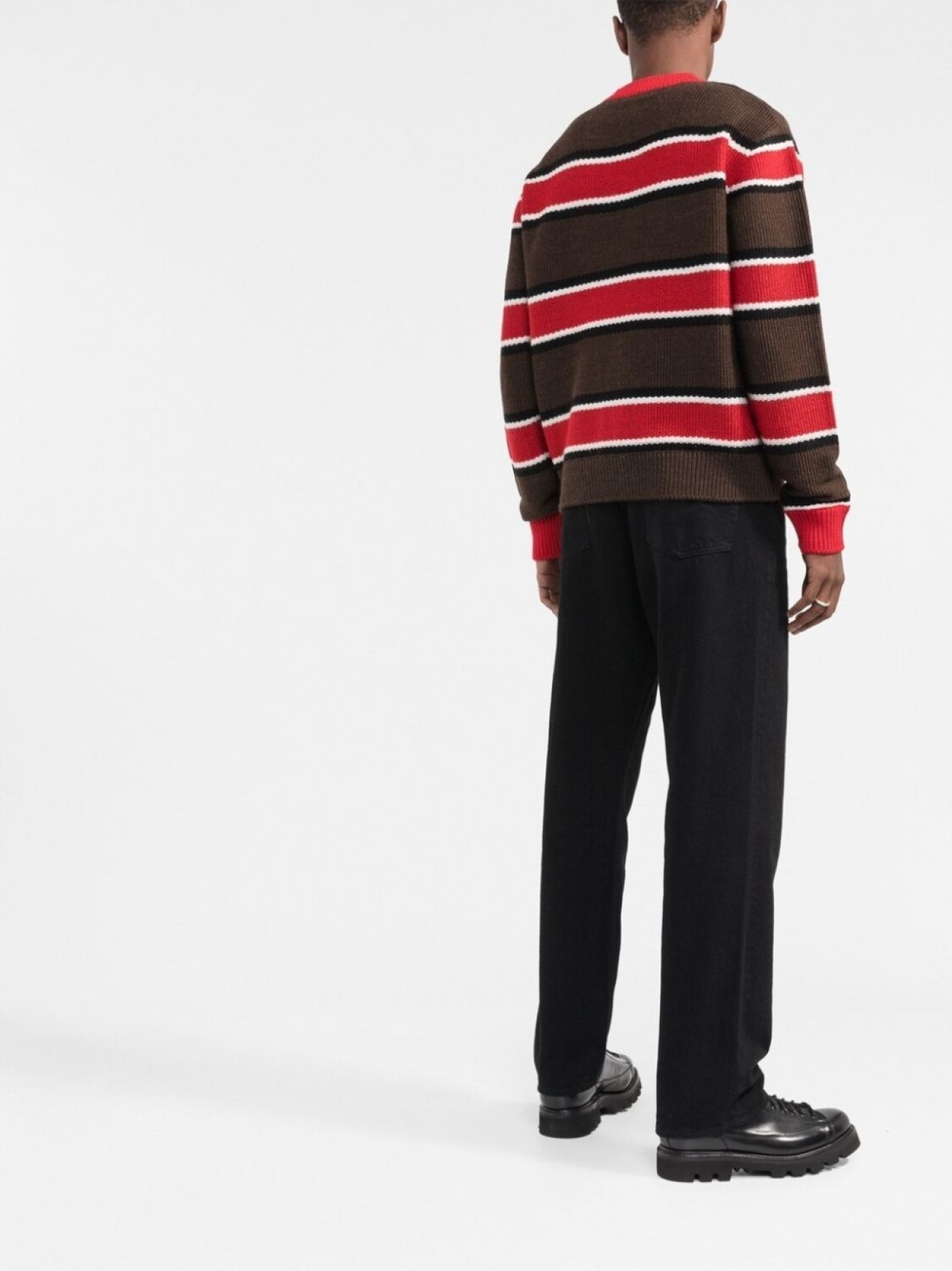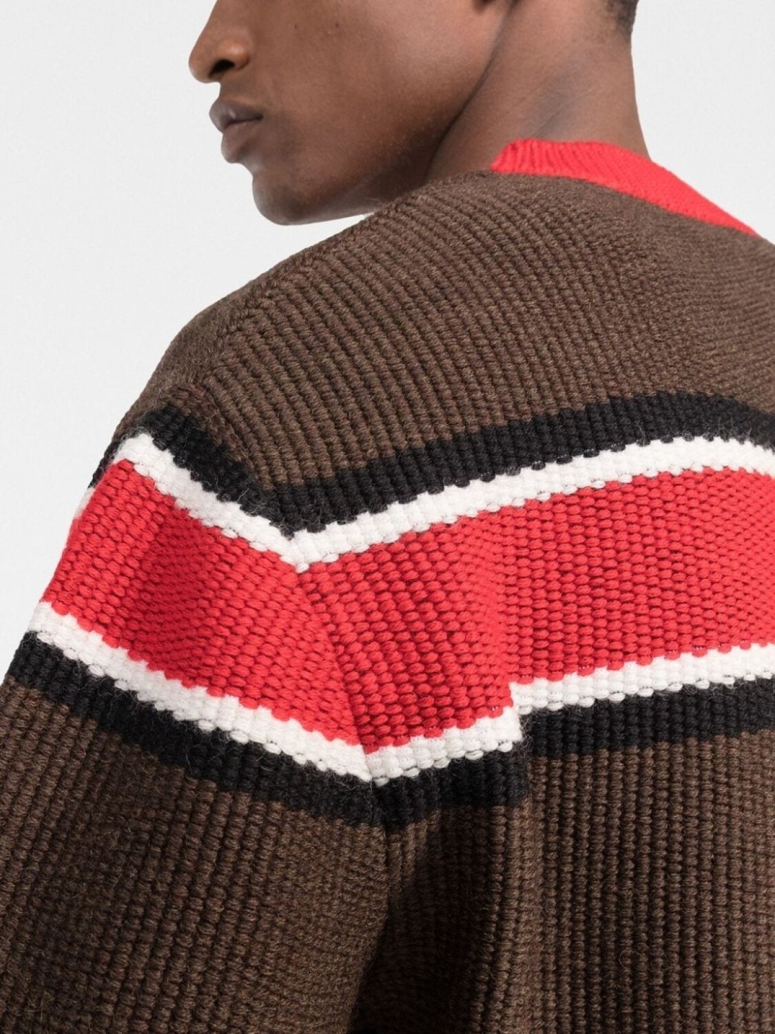 Коричневый, красный, необработанная шерсть, жаккардовый логотип, узор в горизонтальную полоску, круглый вырез, длинные рукава и отделка в рубчик.