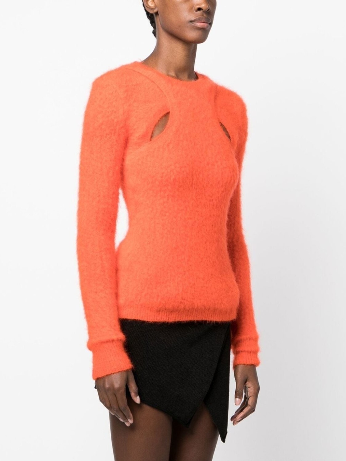 Оранжевый, мохер, вырезные детали, круглый вырез и длинные рукава.