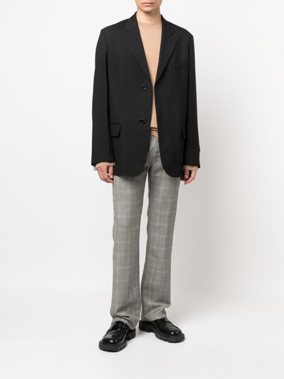Бежевый, черный, необработанная шерсть, тонкая вязка, нашивка с логотипом спереди, круглый вырез и длинные рукава.