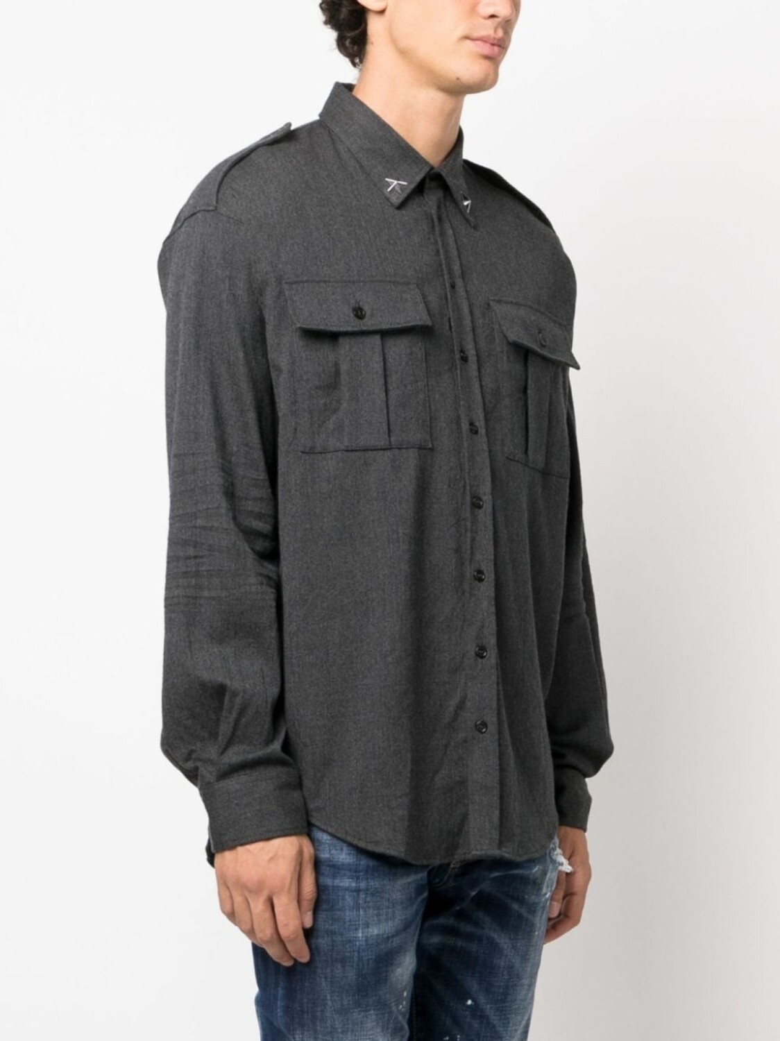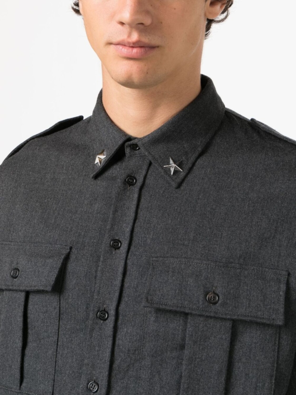 Угольно-серый, смесовая необработанная шерсть, заклепки в форме звезд, эполеты, классический воротник, застежка на пуговицах спереди, длинные рукава, манжеты на пуговицах и два передних кармана с клапанами.
