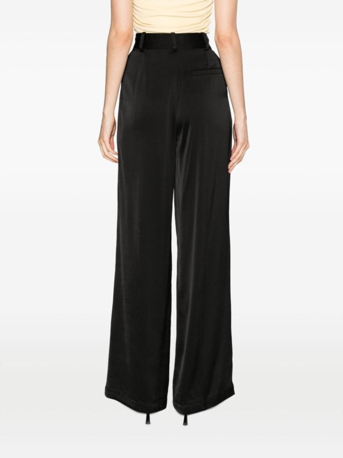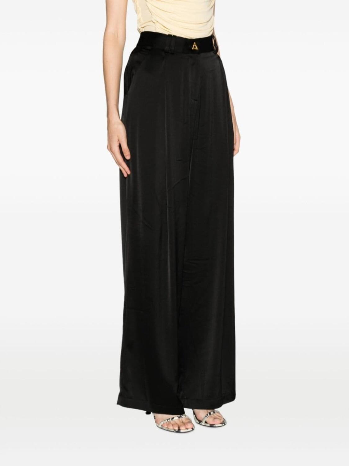 Черный, сатиновая фактура, завышенная талия, золотистый металлический логотип, потайная застежка на молнии и пуговицах, петли для ремня, два прорезных кармана по бокам и широкий крой.