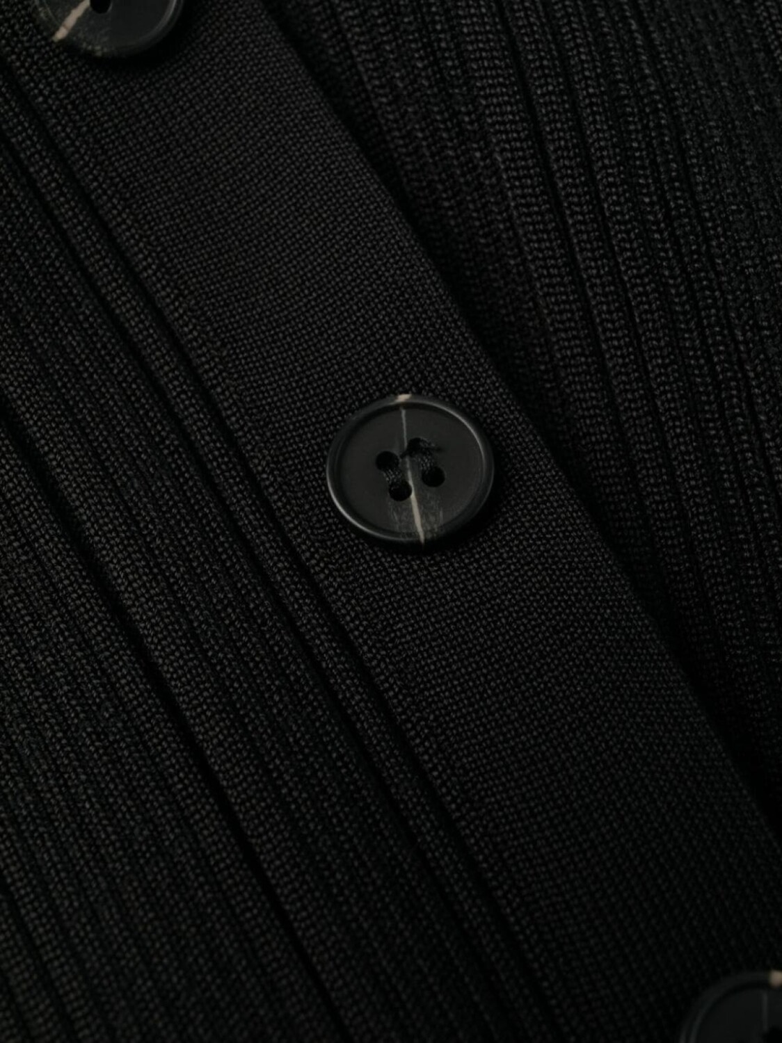 Черный, трикотаж в рубчик, полупрозрачный дизайн, асимметричная форма, вырезные детали, вырез-лодочка, эластичный пояс, пуговичная застежка сбоку, длинные рукава и длина миди.