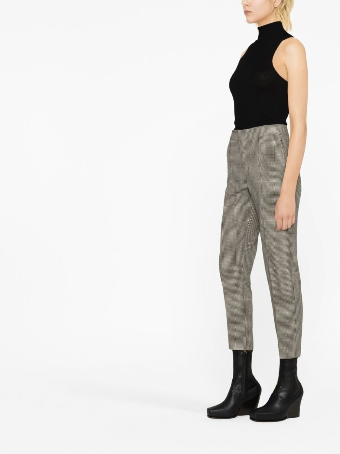 Черный/белый, узор в ломаную клетку, декоративные швы, завышенная талия, потайная застежка спереди, два прорезных кармана на пуговицах сзади и зауженный крой.