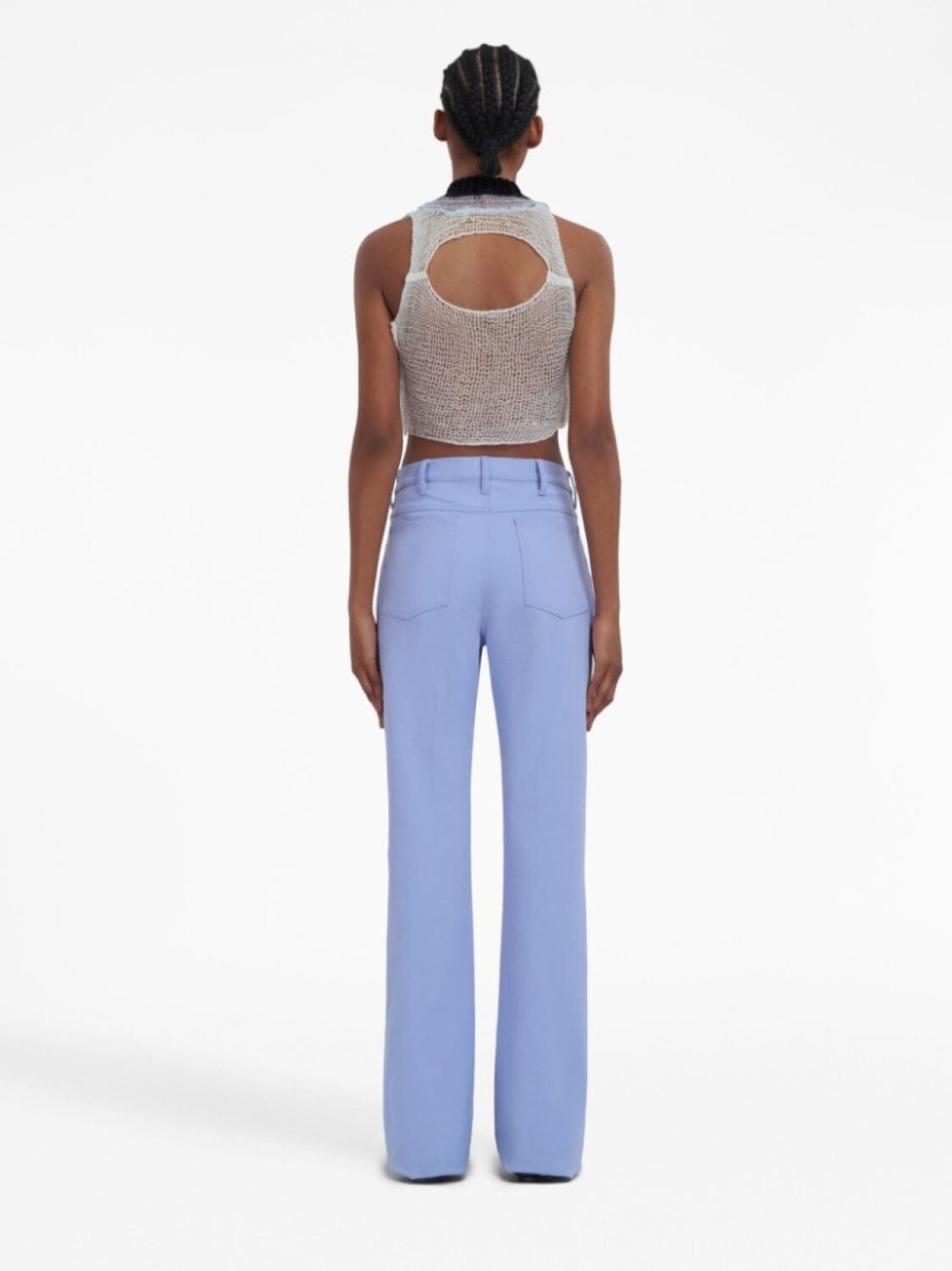 Сирень, стрелки, петли для ремня, застежка на молнии и пуговице спереди, два кармана по бокам, два накладных кармана сзади, прямой крой и длина макси.