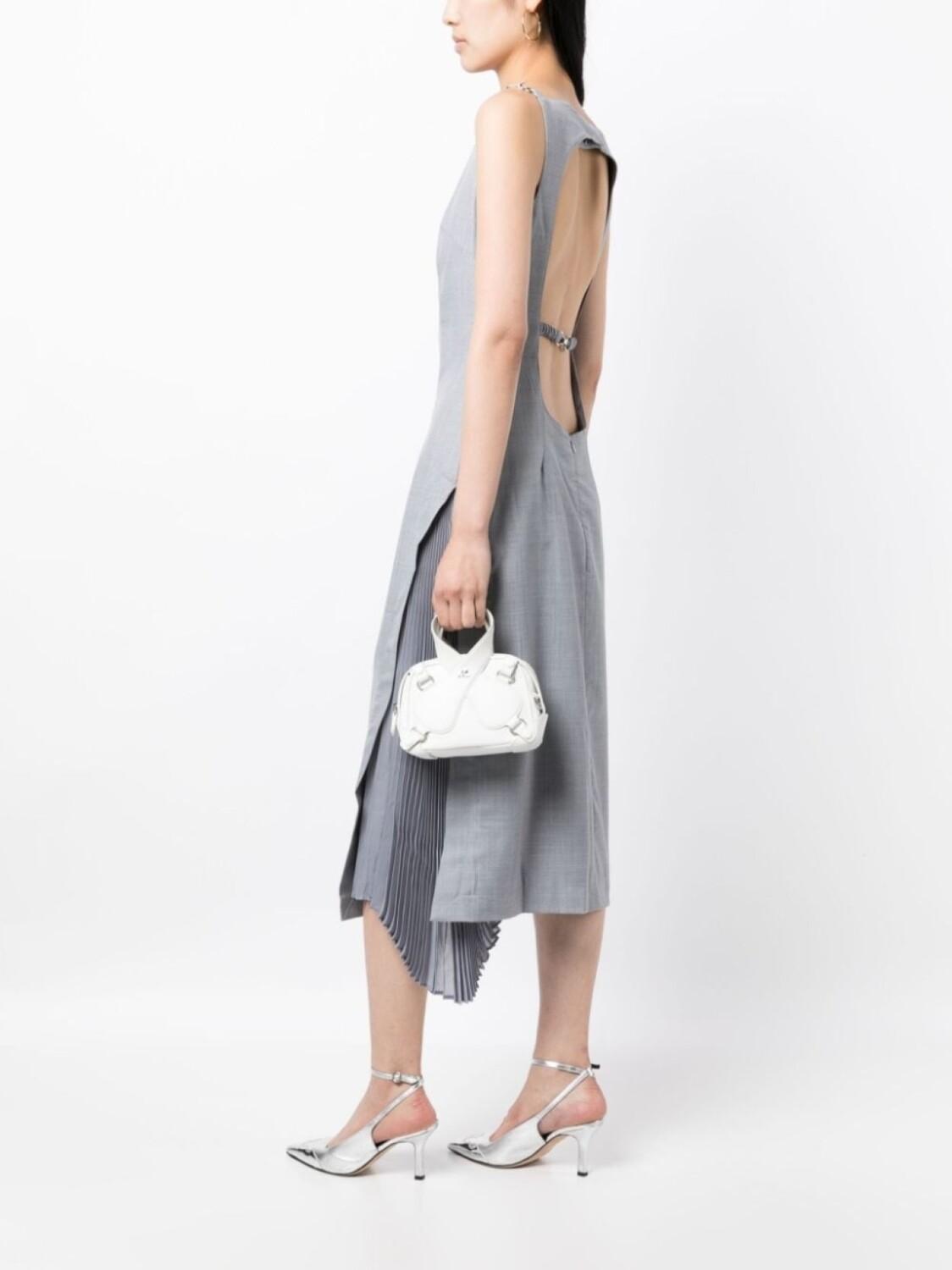 Светло-серый, расклешенный крой, складки, широкий вырез, открытая спина, без рукавов, приталенный силуэт и длина миди.