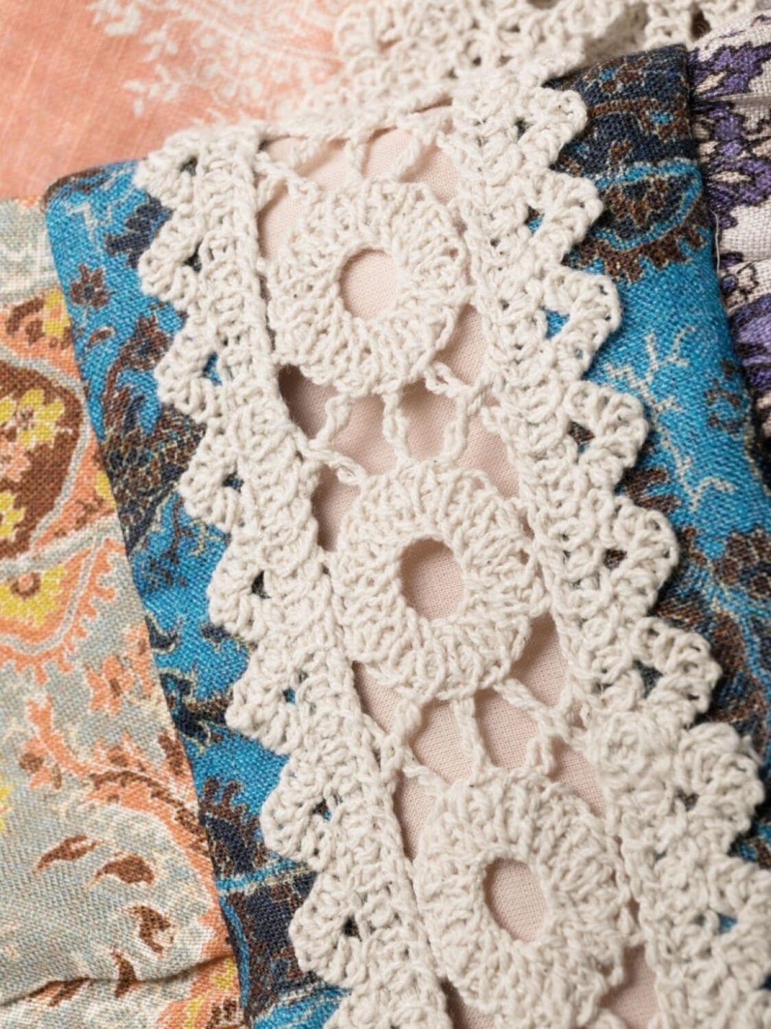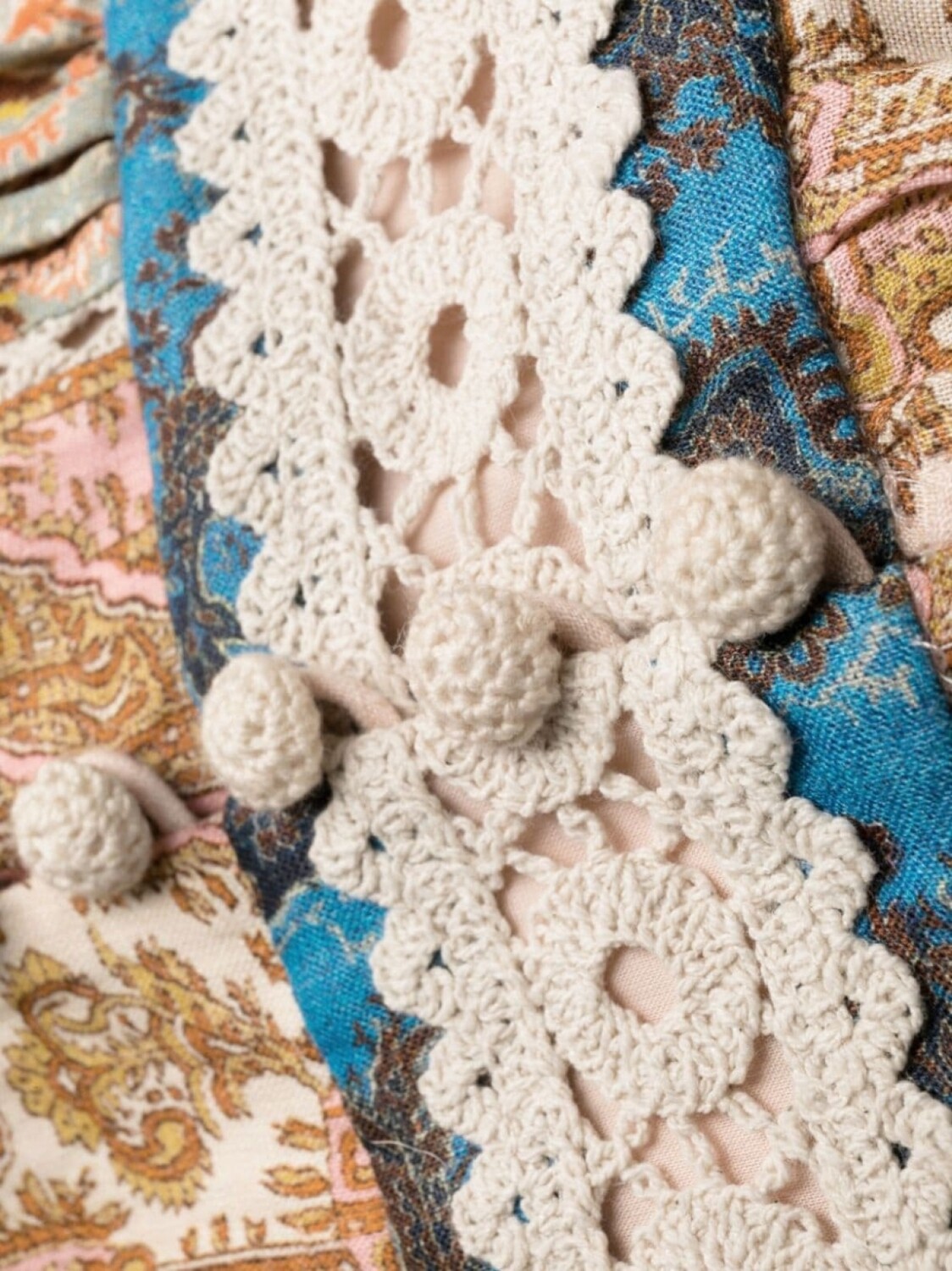 Разноцветный, хлопок, смешанный принт, отделка в технике кроше, объемные рукава, расклешенная юбка и длина миди.