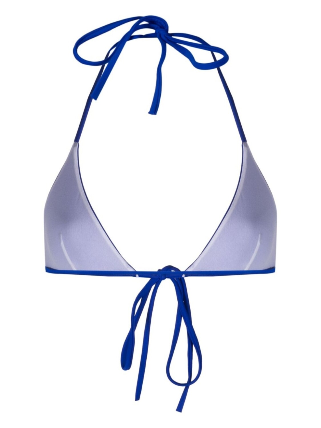 Синий, эластичный материал, треугольная чашка, завязки вокруг шеи и застежка на узел. Пожалуйста, примеряйте купальники и пляжные шорты только поверх собственного белья.
