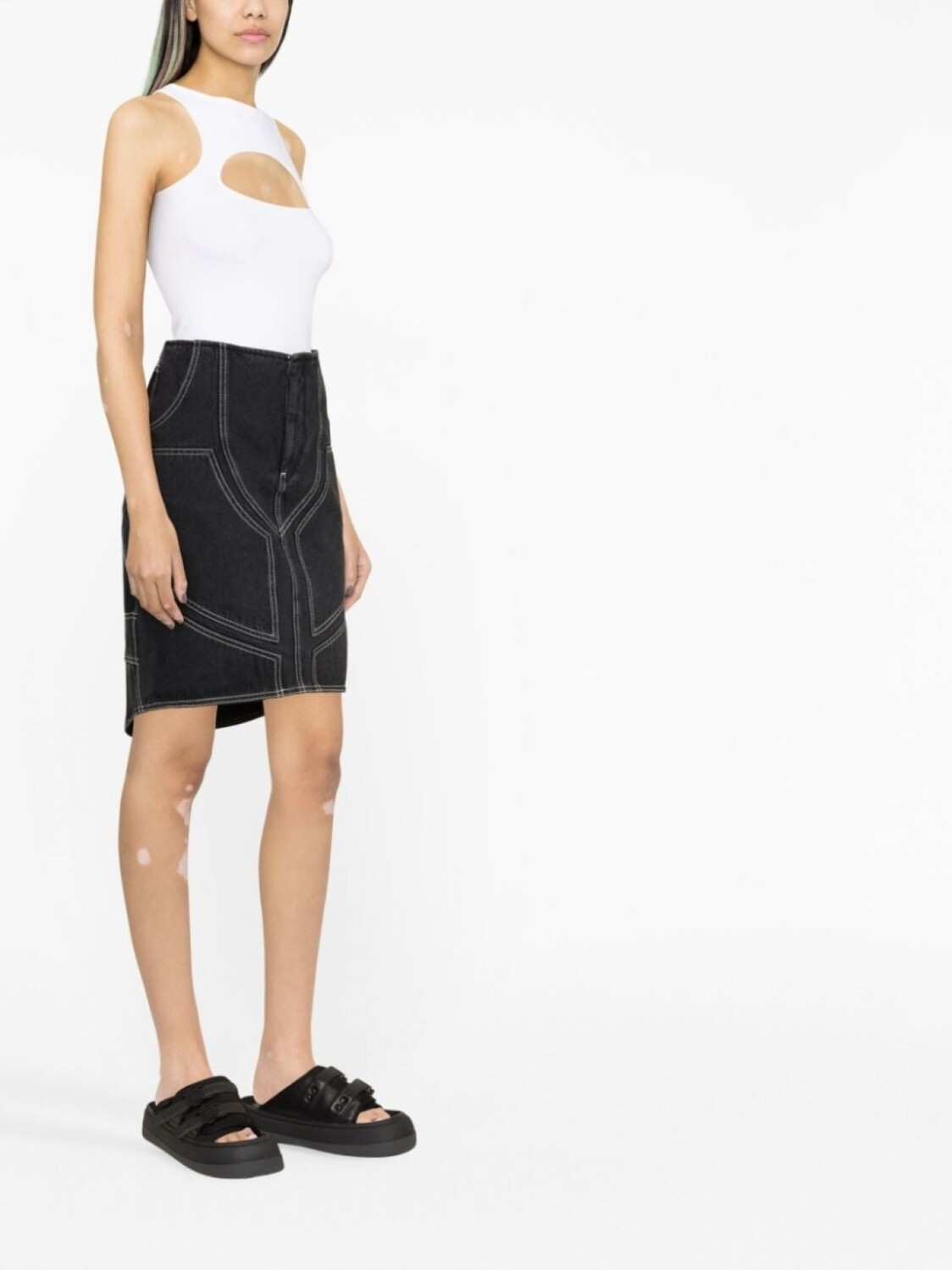 Белый, эластичный материал, вырезные детали, нашивка с логотипом сзади, круглый вырез, без рукавов и вырез рейсер.