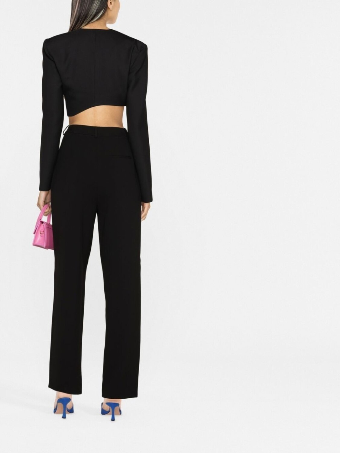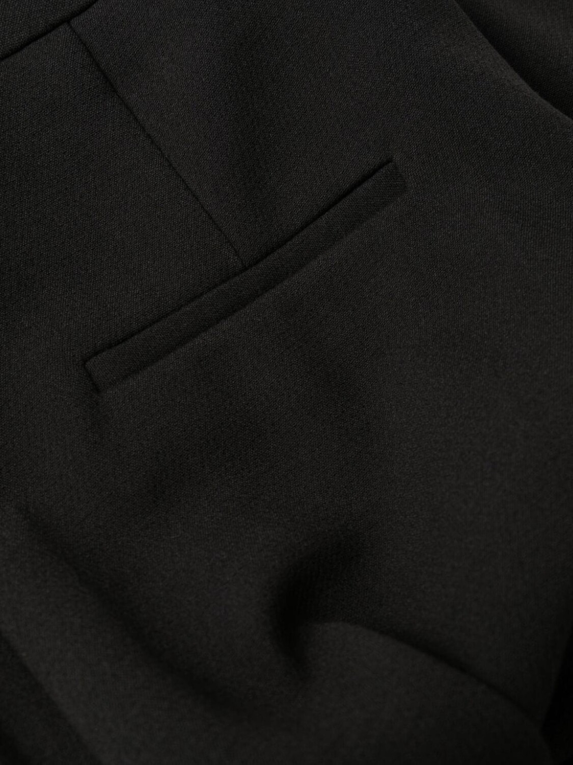 Черный, прямой крой, завышенная талия, петли для ремня, потайная застежка спереди и два прорезных кармана по бокам.