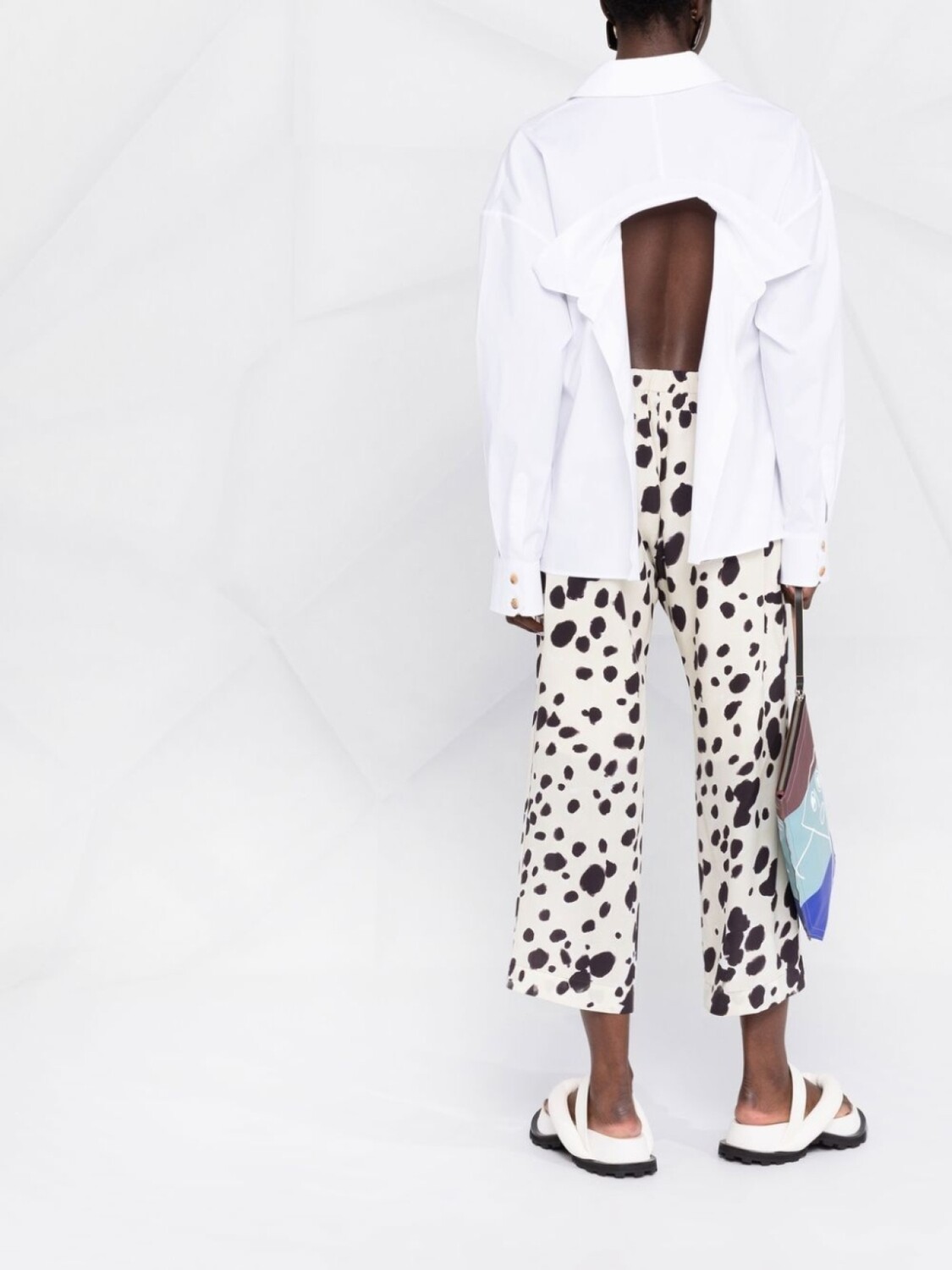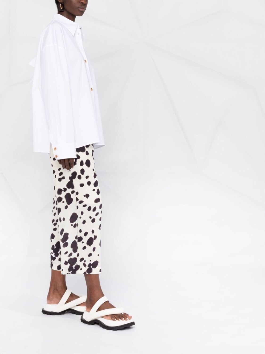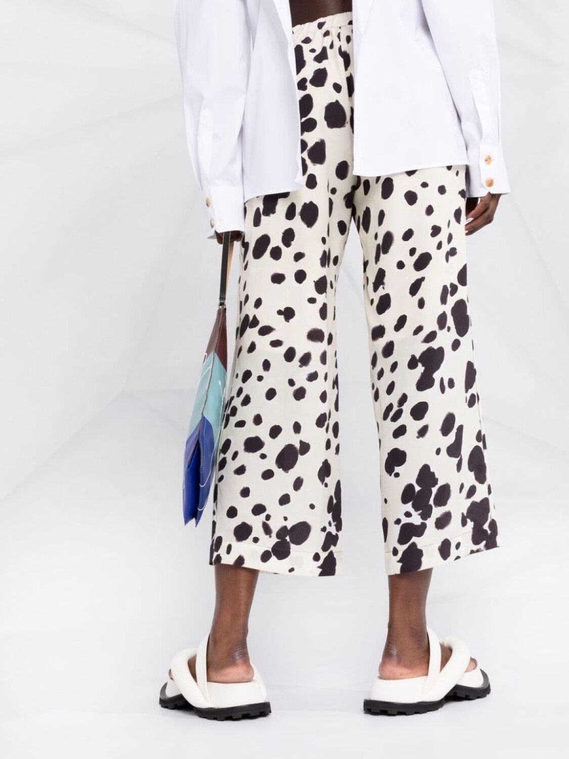 Белый, коричневый, завышенная талия, эластичный пояс, коровий принт, укороченная длина и прямой крой.