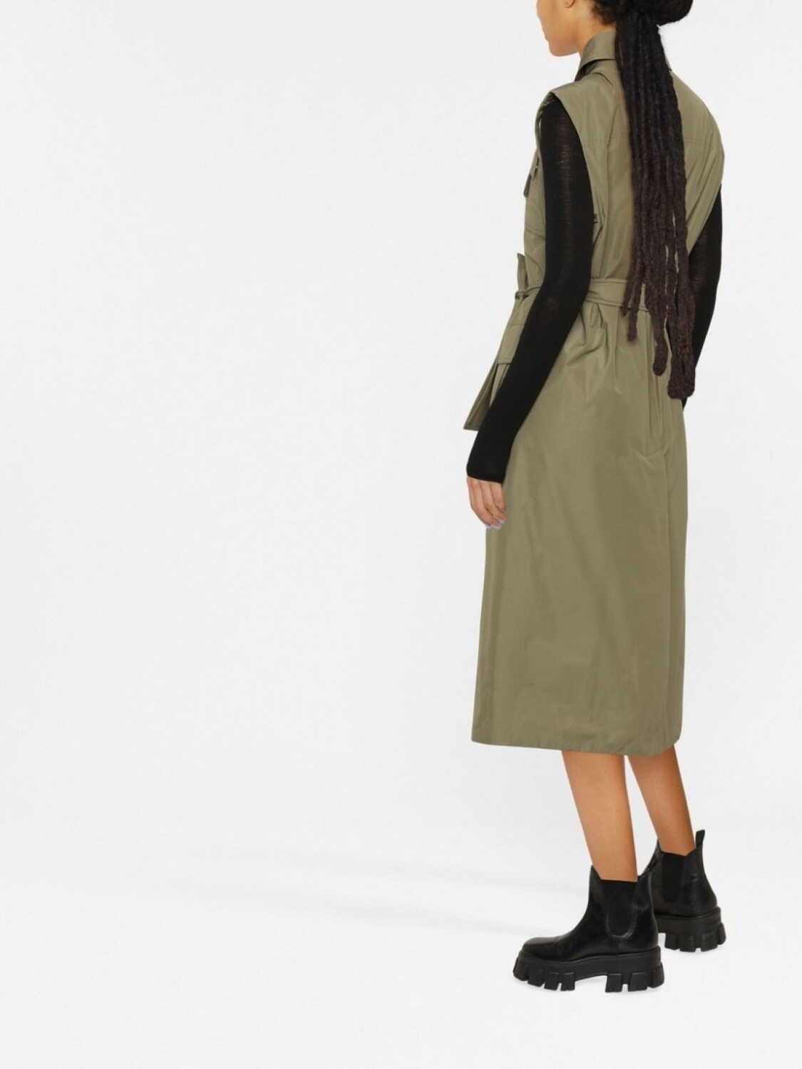 Два кармана с клапанами по бокам, ремень на талии, потайная застежка спереди, плоский заостренный воротник, без рукавов, длина миди и прямой подол.