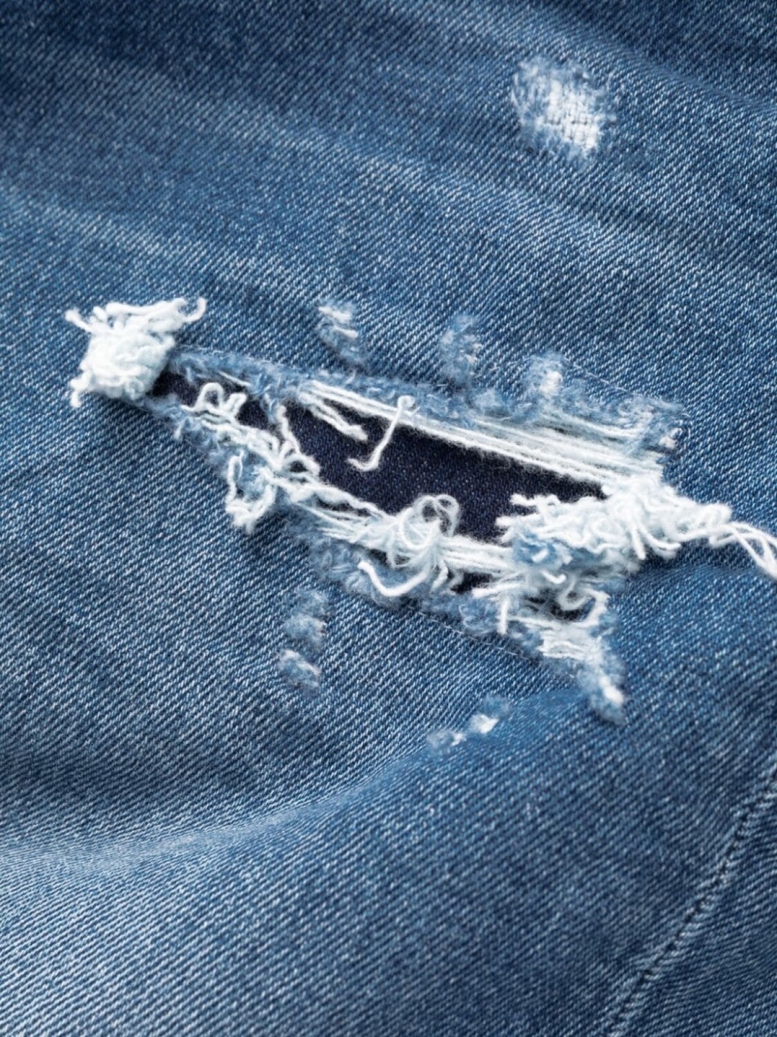 Индиго, эластичный хлопок, эффект потертости, эффект потертости, модель с прорезями, нашивка с логотипом сзади, средняя посадка, петли для ремня, застежка на молнии и пуговице спереди, пять карманов, узкий крой и укороченная длина.