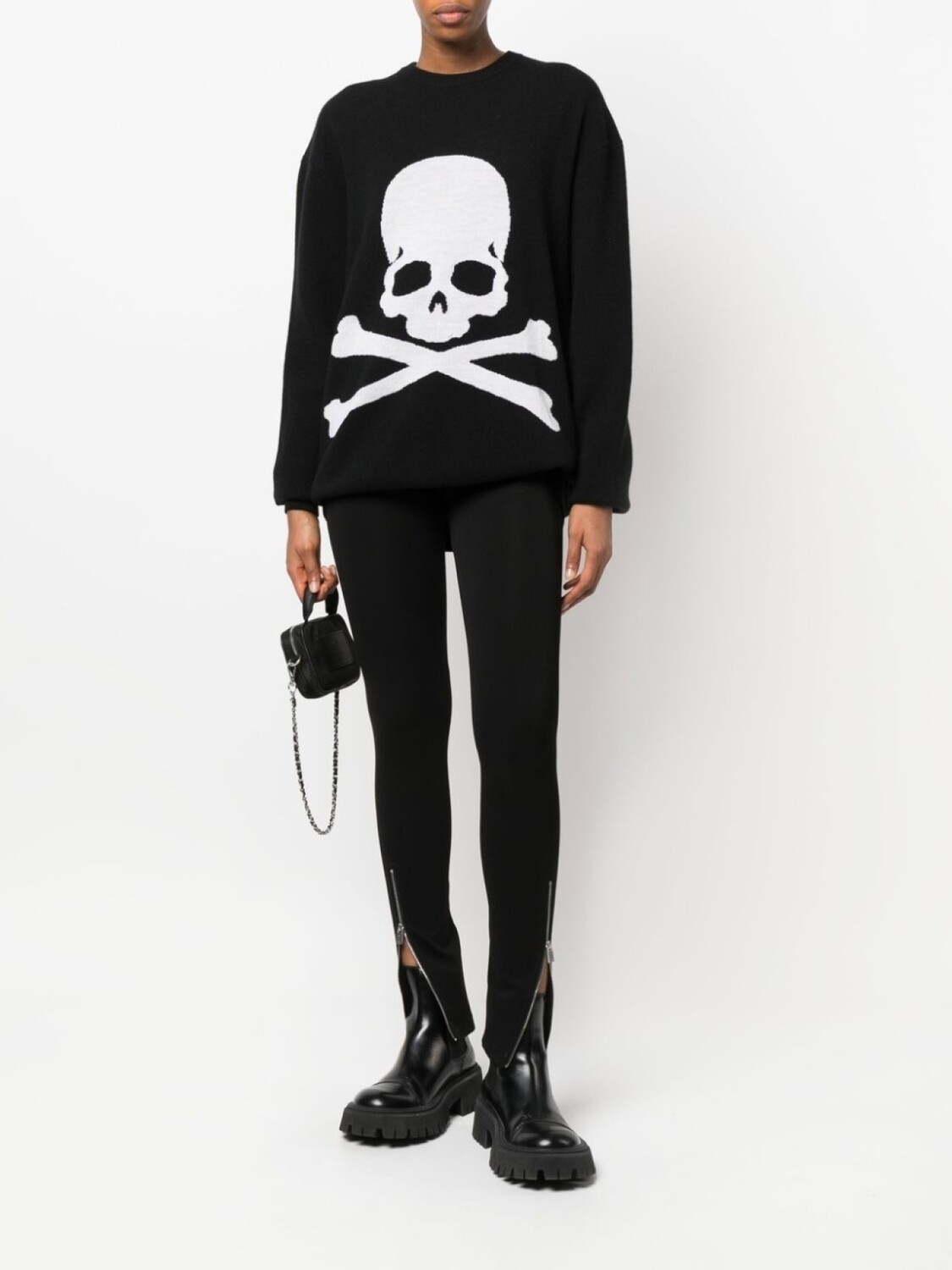 Черный, шерсть, принт с изображением черепа, логотип в технике интарсия, круглый вырез и длинные рукава.