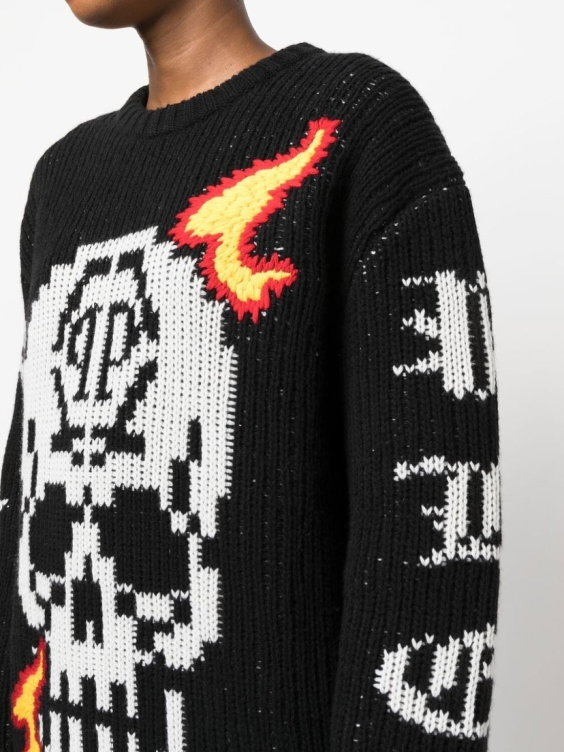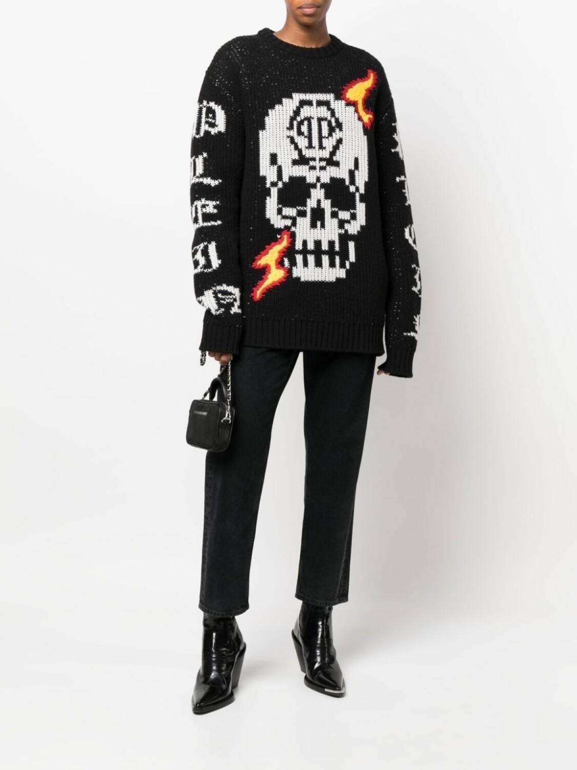 Черный, овечья шерсть, принт с изображением черепа спереди, логотип в технике интарсия, круглый вырез и длинные рукава.