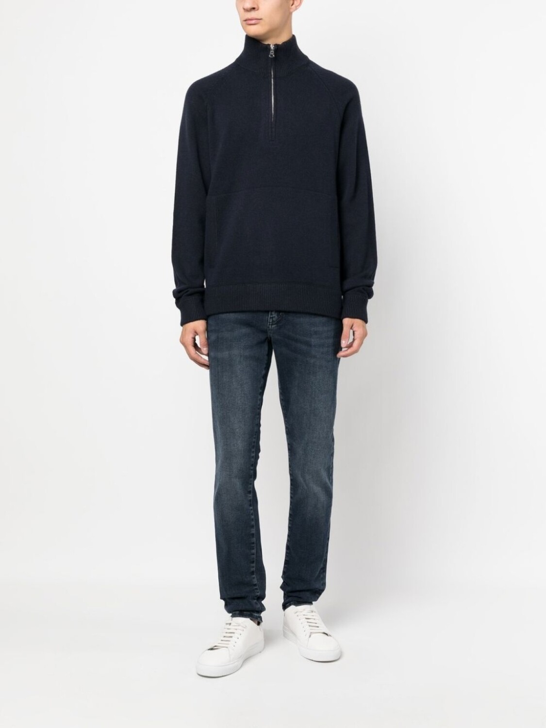 Темно-синий, смесь шерсти и кашемира, детали в рубчик, высокий воротник, застежка на молнии спереди, длинные рукава, карман-муфта и прямой подол.