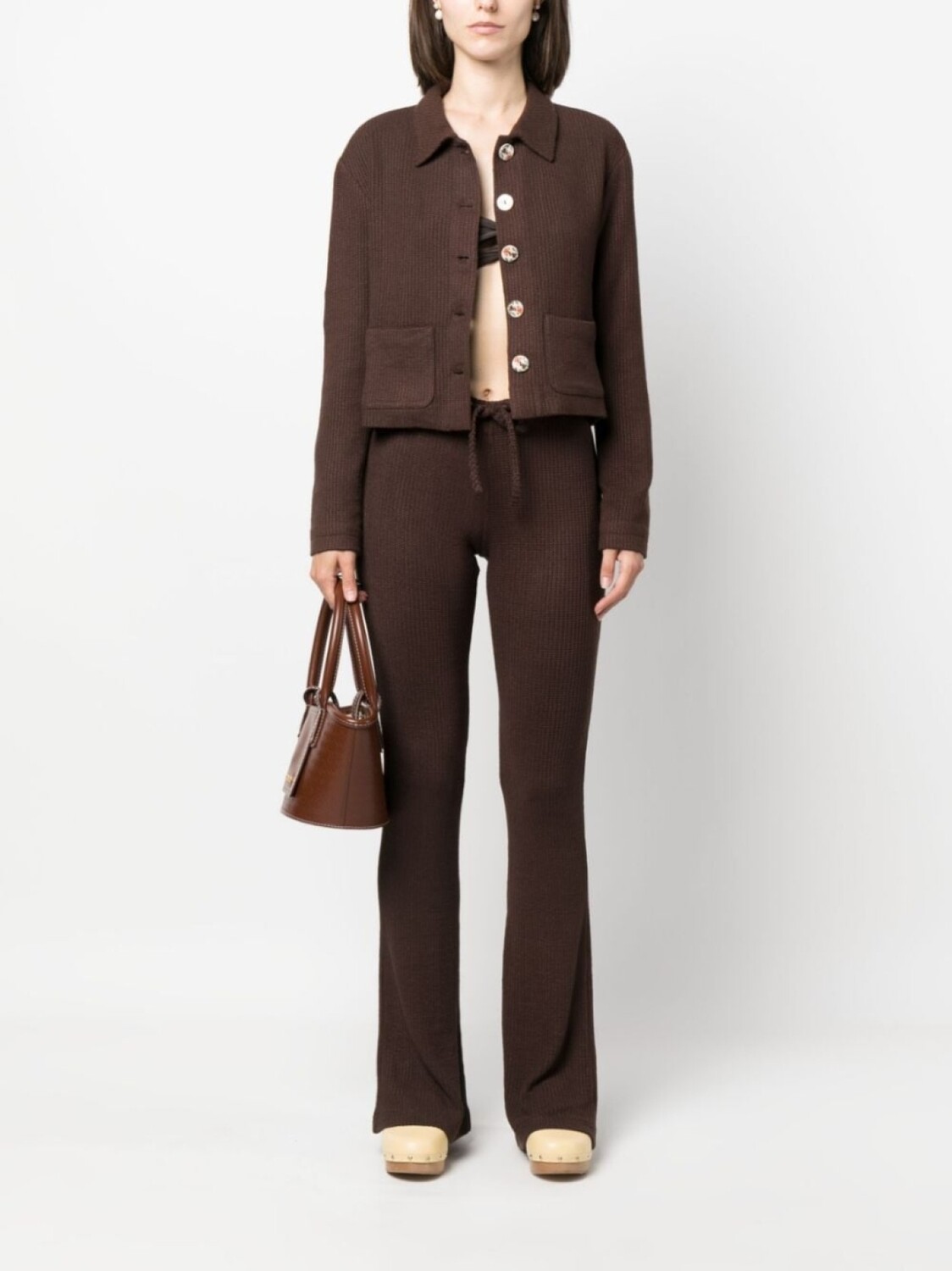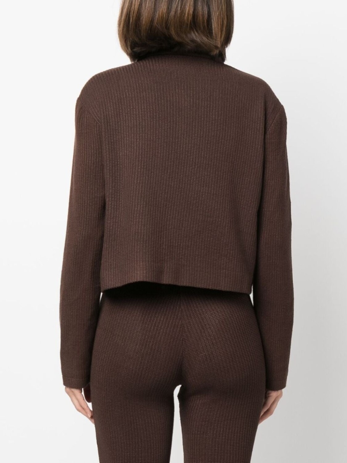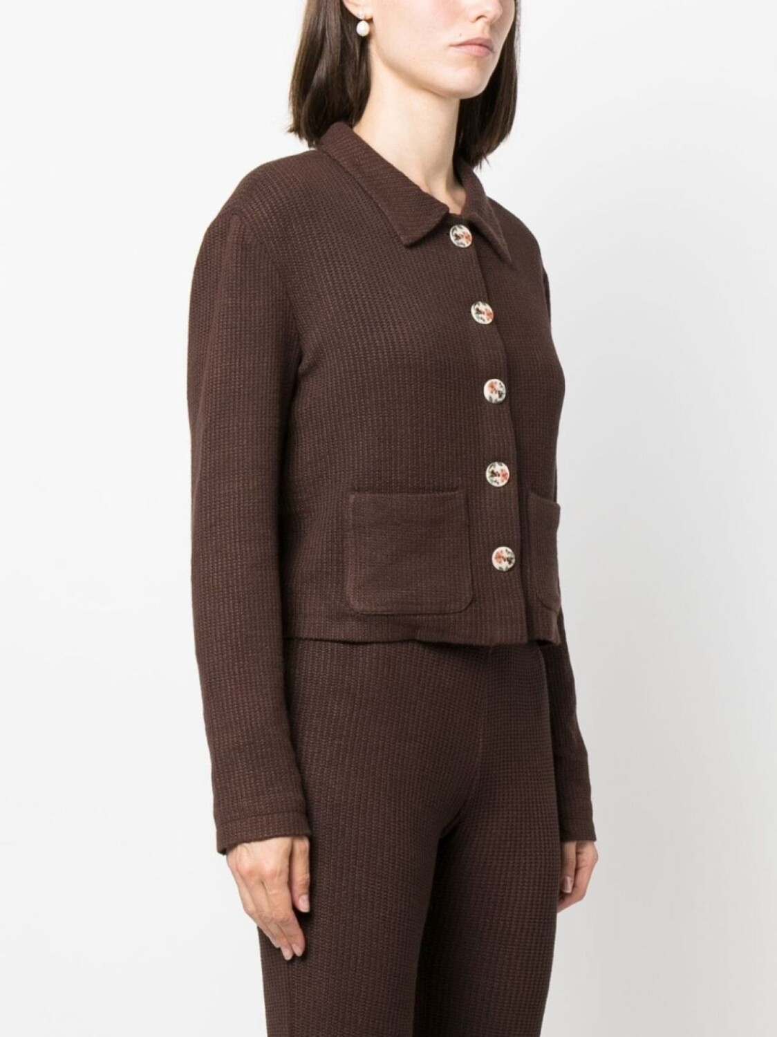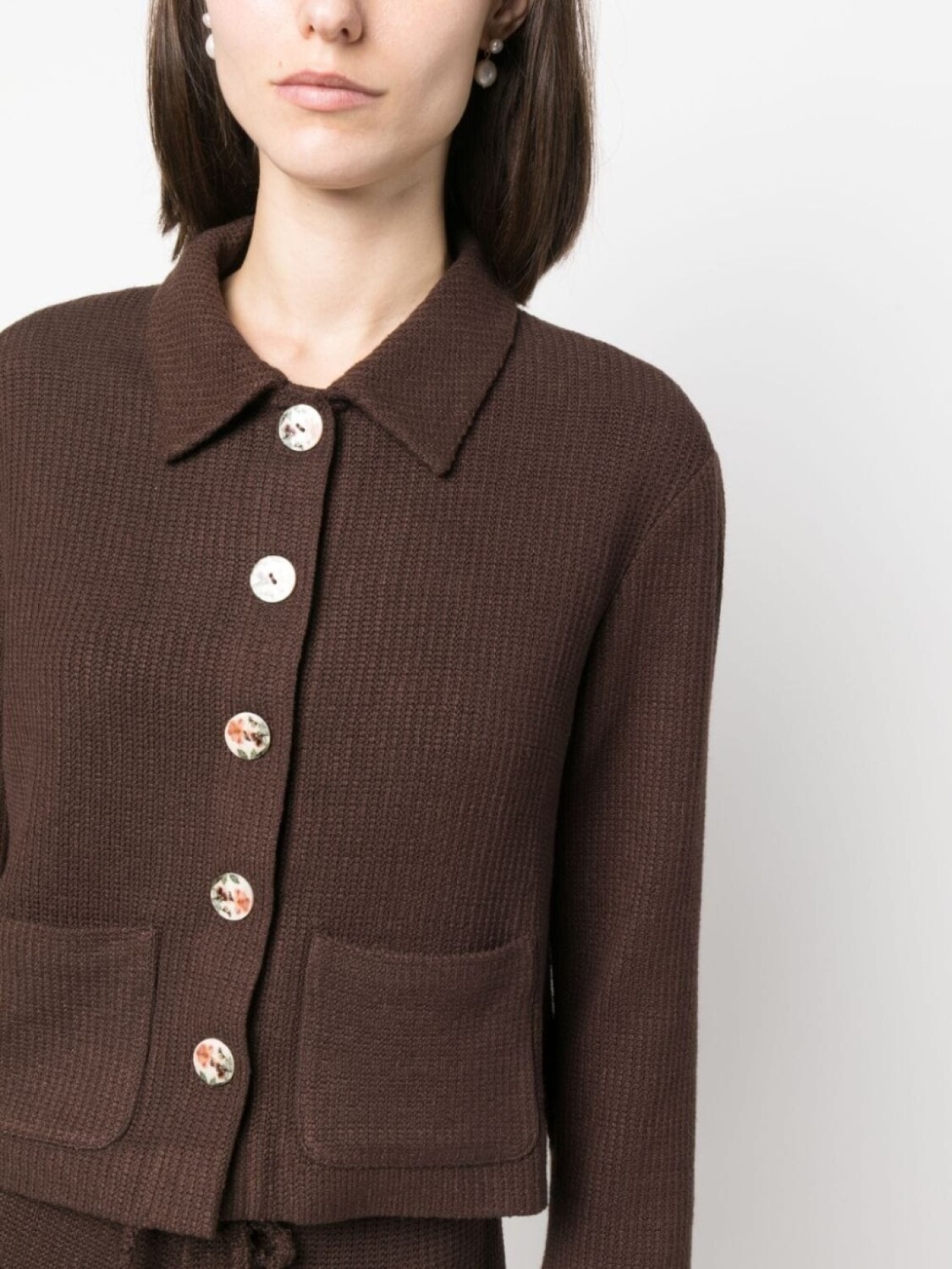 Коричневый, эластичный материал, трикотажный материал, укороченная длина, плоский заостренный воротник, застежка на пуговицах спереди, длинные рукава, два накладных кармана спереди и прямой подол.